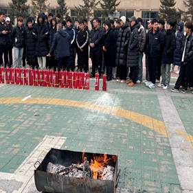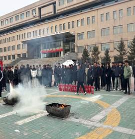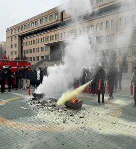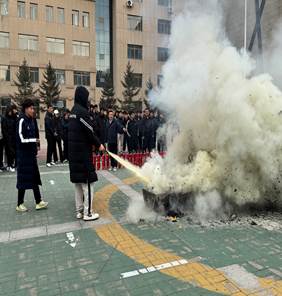 专题讲座结束后,全体学生来到学校体育馆前面进行了现场灭火演练。在消防人员的指导下,同学们亲自操作灭火器,掌握了灭火的实际技能。
