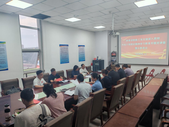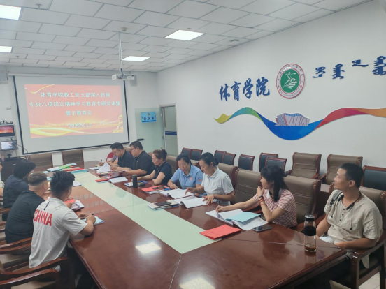 6月12日17时,体育学院教工党支部于体育馆三楼会议室召开深入贯彻中央八项规定精神学习教育专题党课及警示教育会,全体党员教师参会,会议由教工党支部书记包金海主持。