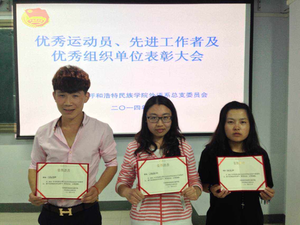 在2014年学院那达幕大会及田径运动会中我系运动员拼搏努力,充分发挥了“友谊第一,比赛第二”的风格和“更好、更快、更强”的体育精神,为鼓励同学们积极参加体育运动,加强锻炼,结合比赛实际,授予查干牧仁等3名同学为系级优秀运动员称号;结合出勤、纪律等情况授予2012日2班等3个班集体为优秀组织单位称号;结合工作服务表现,授予包木其尔等10名同学为运动会工作先进工作者荣誉称号。