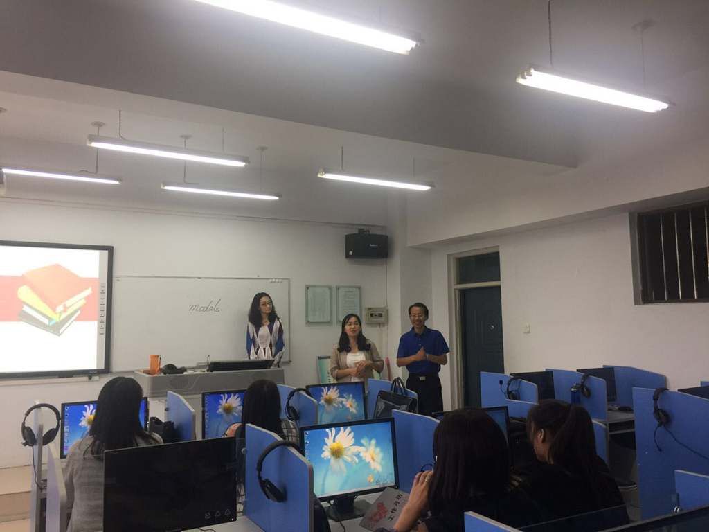 2017年9月14日下午2:30,外语系在都林楼612语音室组织召开《新世界交互英语视听说》教材及教学平台培训会。培训会由外语系公共外语教研室主任敖登副教授主持,清华大学出版社大区总监张兴先生、内蒙古大学外国语学院赵澍副教授受邀参会授课,公共外语教研室全体专任教师及外聘教师到场聆听。