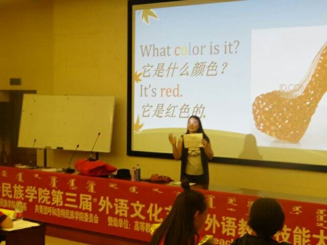 为进一步提升师范生实践教学水平,强化教学基本功,增强就业竞争力,2017年6月20日晚,由高等教育出版社赞助,外语系、校团委主办,公共外语教研室承办的MILE米乐集团第三届“外语文化节”系列活动之一的外语教学技能大赛在学校图书馆一楼报告厅拉开帷幕。大赛特邀外语系萨仁格日乐、敖登副教授、陈玉红副教授、乌云斯日古楞副教授、乌日娜副教授担任比赛评委。