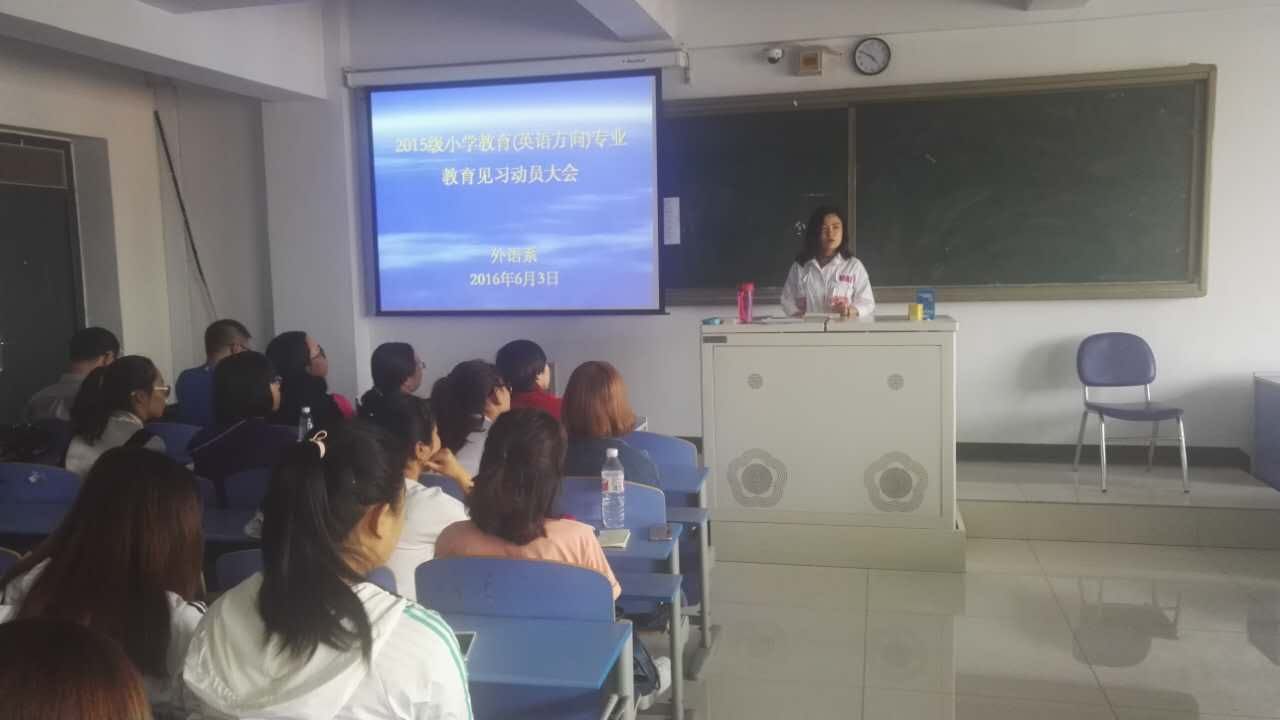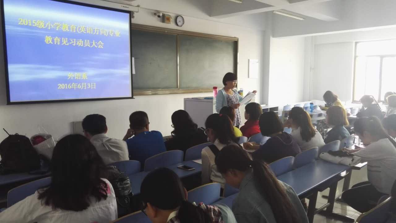 本次见习动员大会的召开,使2015级小学教育(英语方向)专业的学生们了解了见习工作任务,认识到见习的重要性,明确了纪律要求,为他们顺利完成见习任务奠定了良好的基础。