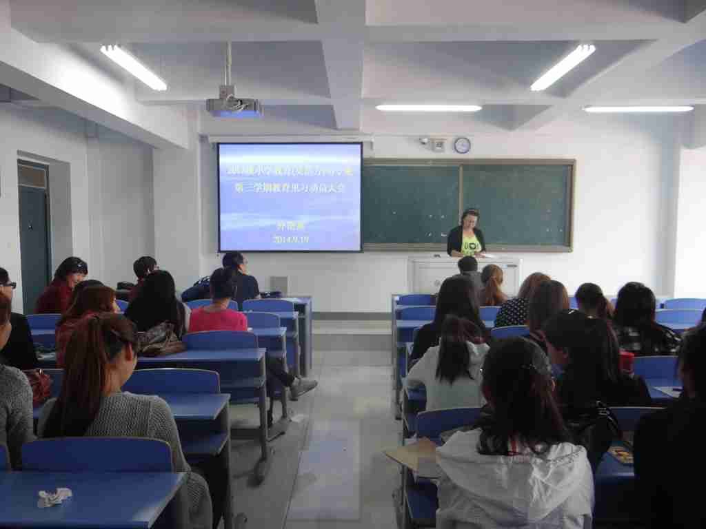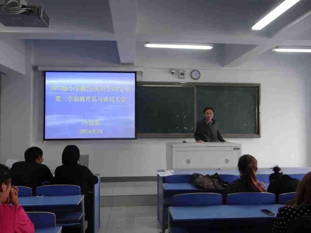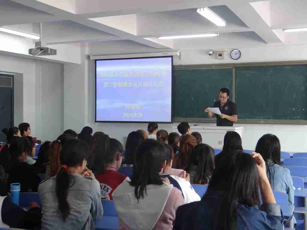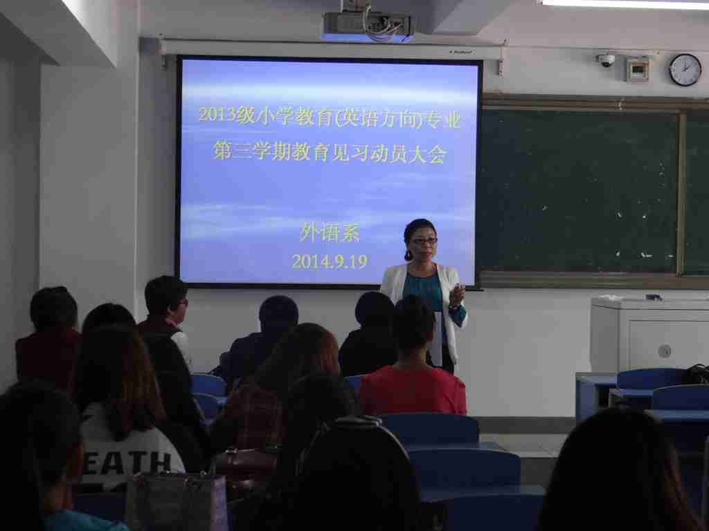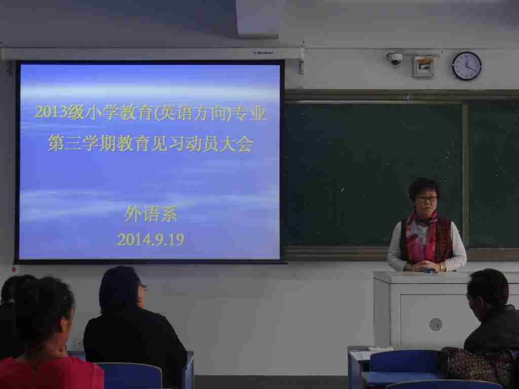 外语系于2014年9月19日中午12时在外语系602教室进行了外语系2013级小学教育(英语方向)专业第三学期教育见习动员大会。大会由外语系英语教研室负责人红霞主持,见习指导教师王牧兰、乌日娜、乌云斯日古楞、王磊、胡日查、陈玉红及2013级小学教育(英语方向)专业一、二班全体学生参加。会议开始,由指导教师王磊老师宣读《外语系2013级小学教育(英语方向)专业第三学期见习方案》,明确了教育见习的目的和任务、教育见习内容、教育见习形式及考核评价指标。见习指导教师王牧兰宣读了分组情况。指导教师代表陈玉红对全体见习生提出了严格的要求,要求他们珍惜来之不易的见习机会,认真对待教育见习的每一个环节,遵守纪律,圆满完成教育见习任务。最后,外语系副主任苏日嘎拉图副教授作见习动员,向全体见习生提出了几点要求和希望。要求他们严格要求自己,遵守见习时间、纪律,认真听课,严肃对待见习各环节,全力以赴地完成见习工作。