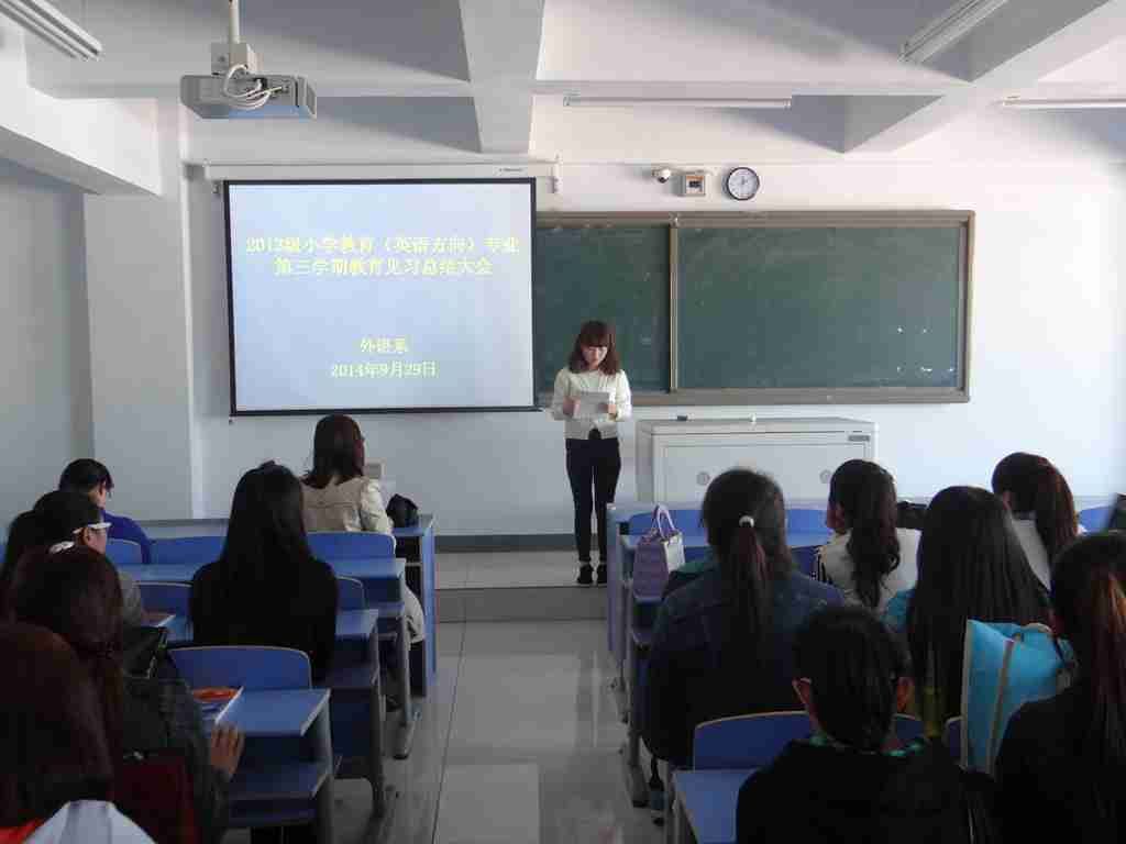 外语系于2014年9月29日中午12时在外语系602教室进行了外语系2013级小学教育(英语方向)专业第三学期教育见习总结会。首先,由2013级小学教育(英语方向)专业一班同学木其尔及2013级小学教育(英语方向)专业二班同学周雪代表见习生发言,总结其在小学所见所闻。其后,由外语系英语教研室负责人红霞对见习工作进行了全面总结,并对见习生寄言,希望他们在以后的专业学习上继续努力,为将来走上教师岗位做好充分的准备。