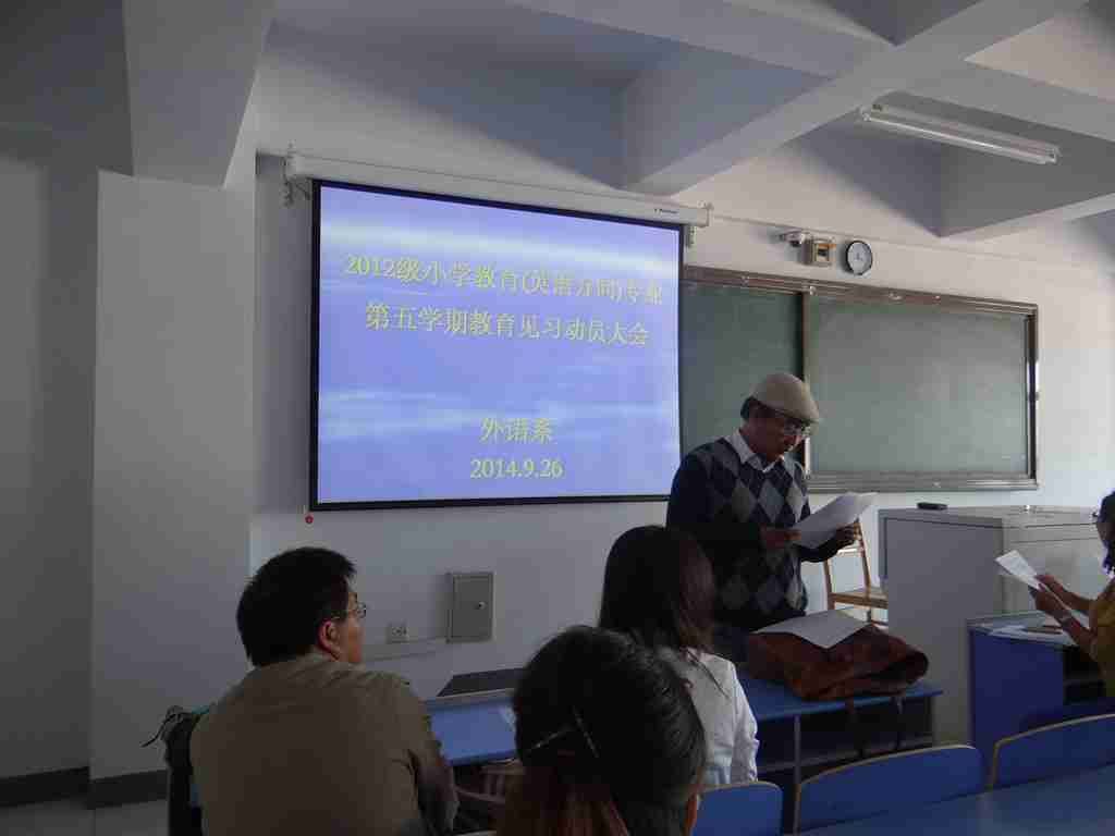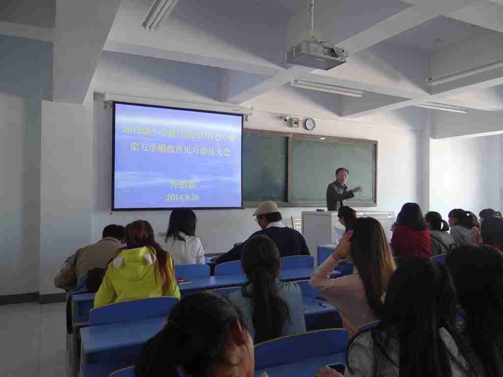 外语系于2014年9月26日中午12时在外语系602教室进行了外语系2012级小学教育专业(英语方向)第五学期教育见习动员大会。大会由外语系英语教研室负责人红霞主持,见习指导教师王牧兰、曼杜呼及2012级小学教育专业(英语方向)一、二班全体学生到会。会议开始,由指导教师王牧兰宣读《外语系2012级小学教育专业(英语方向)第五学期见习方案》,明确了教育见习目的和任务、教育见习内容、教育见习形式及对指导教师的要求。其次,由见习指导教师曼杜呼公布分组情况。最后,英语教研室负责人红霞老师对全体见习生提出了严格的要求,要求学生们严格要求自己,认真对待教育见习的每一个环节,遵守见习时间、纪律,认真听课,圆满完成教育见习的各项工作任务。