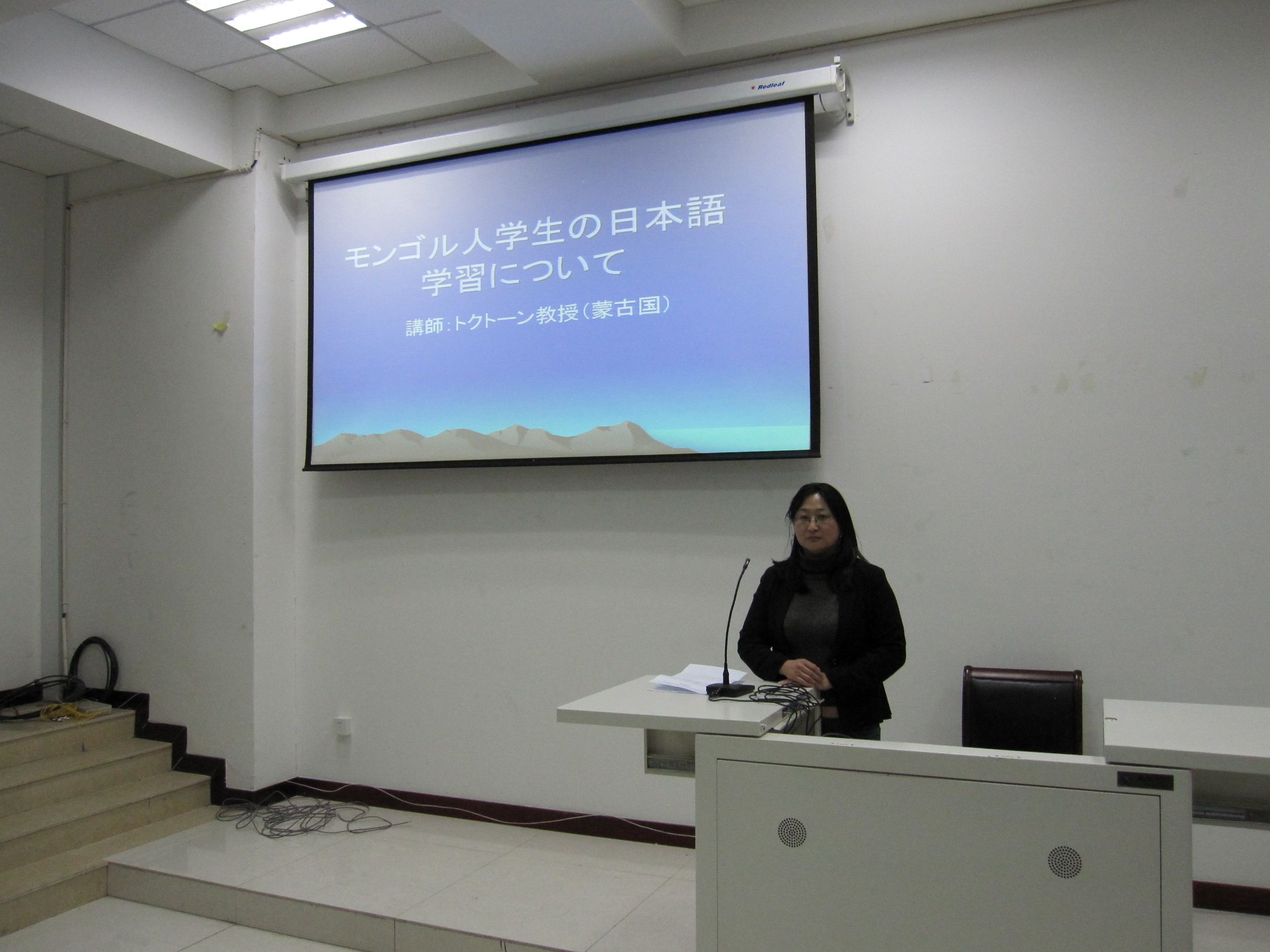 为了提高日语专业师生专业水平,活跃学术交流,2013年11月6日下午4:30—6:00,外语系邀请蒙古国国立大学蒙古语言文化学院外语系Erdenesan Togtuun教授在教学楼106教室为日语专业师生做了题为《蒙古语授课学生日语学习策略》的学术讲座。日语专业教师及日语专业蒙古语授课班学生100多人收听了讲座。