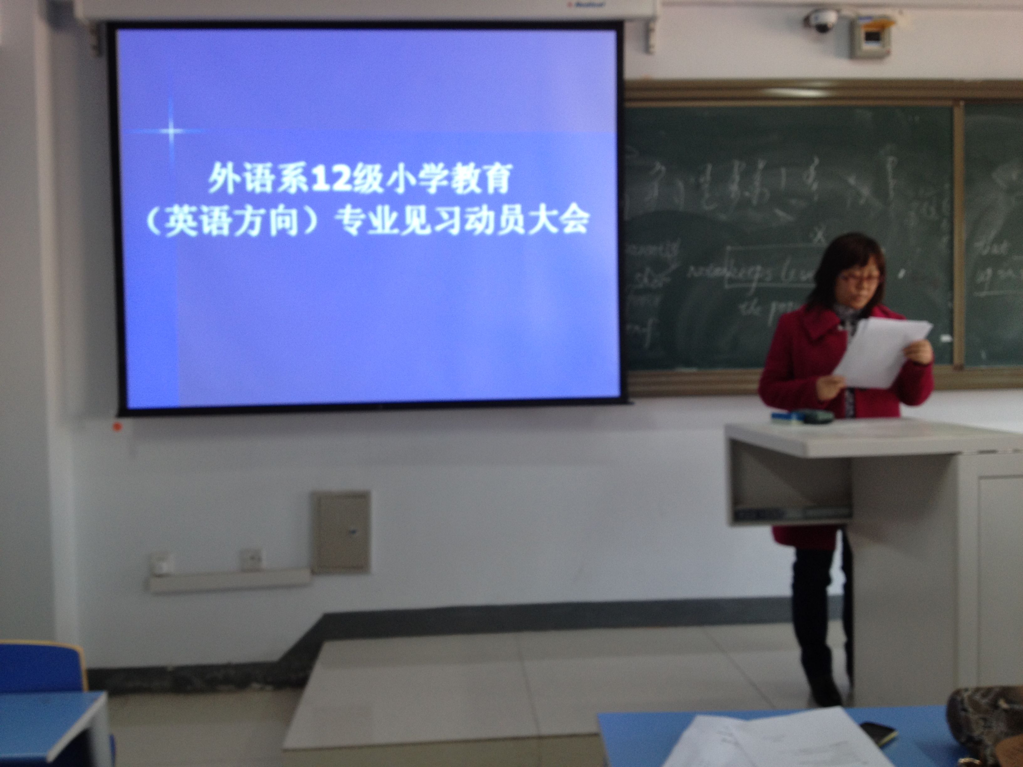 外语系将本学期的见习周安排在2013年3月25日至3月31日。并于2013年3月19日,在新教学楼602教室召开了2012级小学教育(英语方向)专业见习动员大会。动员大会由英语教研室副主任乌云斯日古楞主持,团总支书记包仓宣读了见习方案,指导教师陈玉红对集中见习分组情况进行了说明。见习指导教师、见习学生近80人参加了会议。会议的召开使学生们认识到见习的重要意义,了解了见习任务,明确了纪律要求,为他们顺利完成见习任务打下良好的基础。