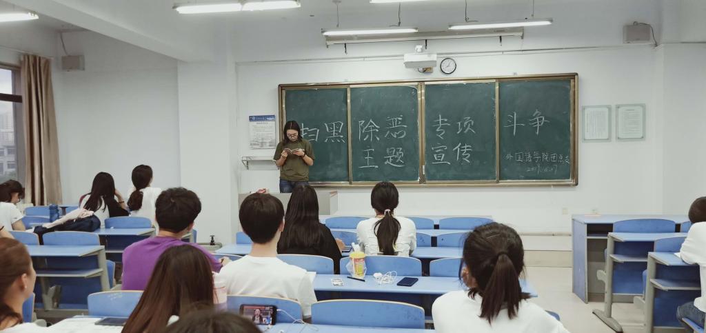 为加强扫黑除恶专项斗争宣传力度,防范黑恶势力进入校园,进一步增强师生的安全意识、法律意识和自我防护能力,净化校园政治生态,保障全校师生的生命财产安全,确保教育教学工作顺利进行,6月17日,外国语学院团总支组织2018级全体学生在都林楼六楼开展了扫黑除恶专项学习活动,重点学习了《扫黑除恶宣传手册》,助力扫黑除恶知识入心入脑。