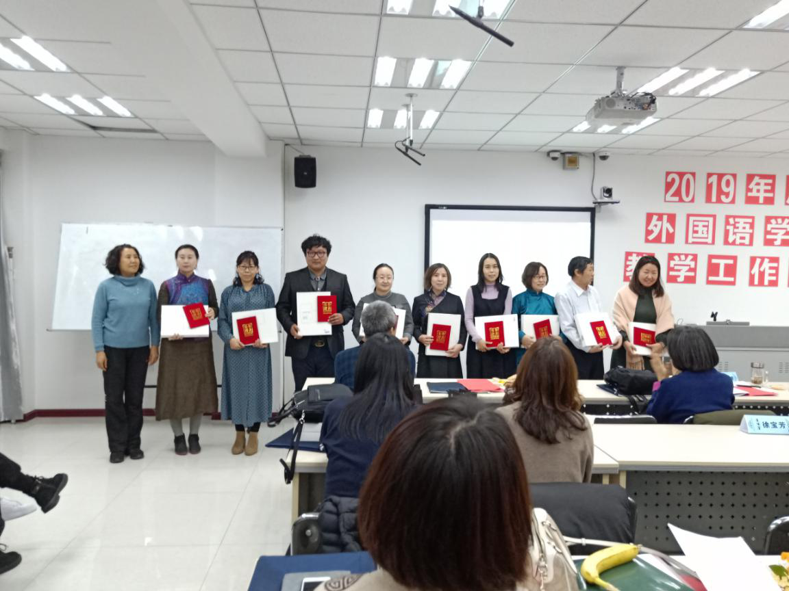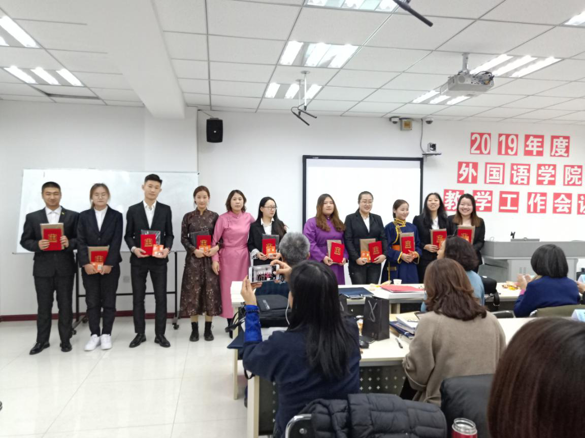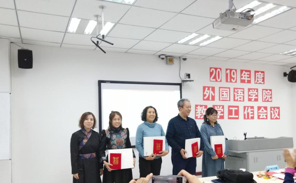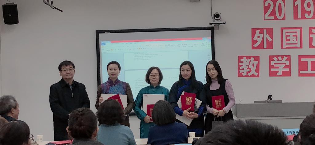 随后,教师代表萨仁格日乐教授、吴丹讲师、涛歌副教授分别作了题为《<英语漫谈蒙古文化>慕课建设与研究》《对申报教学成果奖的几点思考》《微课在民族院校英语口语课程中的应用研究》的报告。接着,由党总支副书记红梅宣读《外国语学院关于表彰2015-2019年度教育教学工作先进个人和优秀学生干部的决定》,并邀请颁奖嘉宾为受表彰师生颁发了证书和奖品。