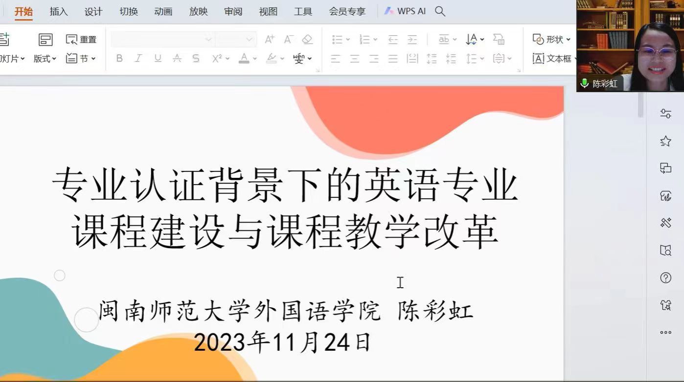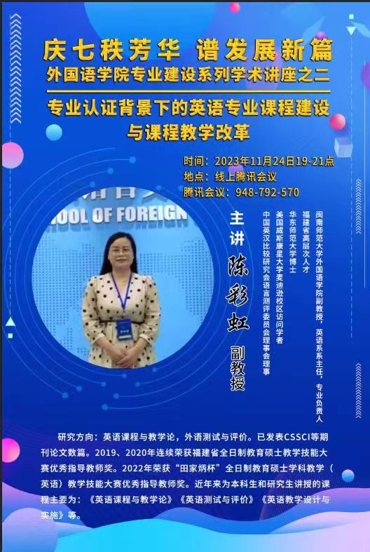 为提升师范专业育人水平,推动教师教育高质量发展,11月24日,应外国语学院邀请,闽南师范大学外国语学院英语系主任陈彩虹教授作题为“师范类专业认证背景下的英语专业课程建设与课程教学改革”专题讲座。外国语学院全体教师参加。