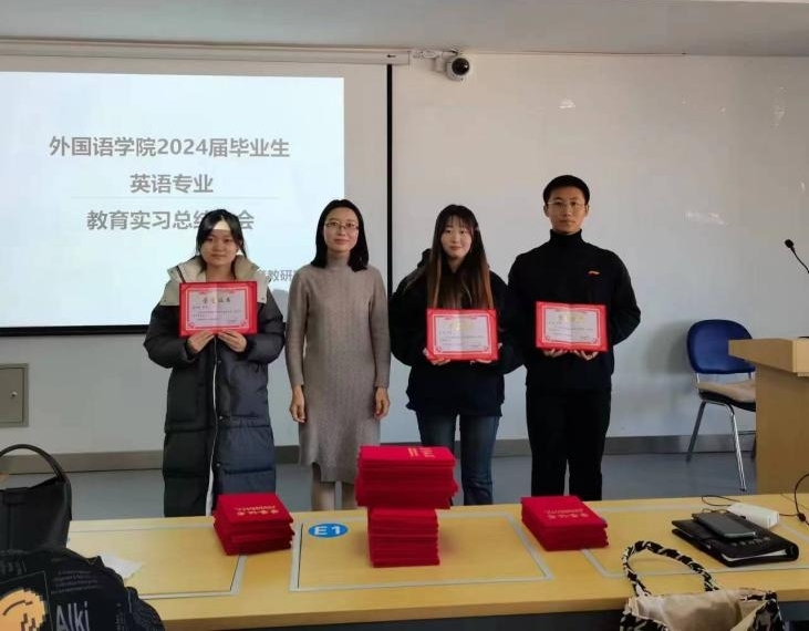 会上,实习生代表包杰、张佳依次对实习情况进行总结和分享,认为实习期间不仅收获了丰富的英语实践教学知识和班主任工作技巧,还进一步提升了英语教学技能。同时,还反思了实习期间的不足与改进方法。