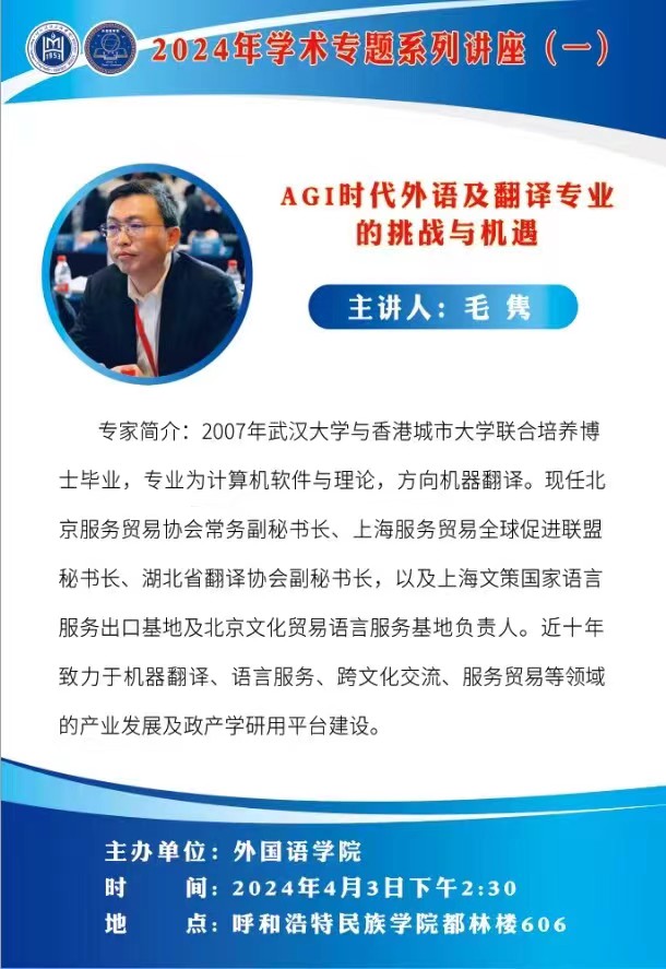 4月3日下午,上海文化贸易语言服务基地董事长毛隽博士应邀为外国语学院师生带来一场题为《AGI时代外语及翻译专业的挑战与机遇》的讲座,本次讲座由外国语学院副院长红鸽主持。