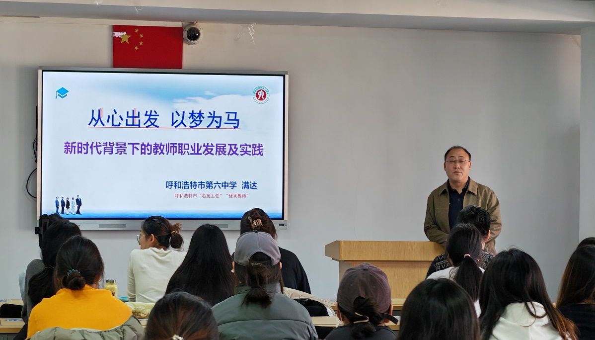 在新时代教育背景下,为深化英语(师范)专业建设,提升英语师范生对中学教育教学及教师职业的深刻理解,12月11日下午,米乐官网荣幸邀请到呼和浩特市第六中学高级教师、呼和浩特市“名班主任”“优秀教师”满达老师,为21级英语(师范)专业学生举办了一场题为《从心出发 以梦为马——新时代背景下的教师职业发展及实践》的专题讲座。此次讲座由英语教育教研室主任乌优主持,21级英语(师范)专业全体学生参与聆听。