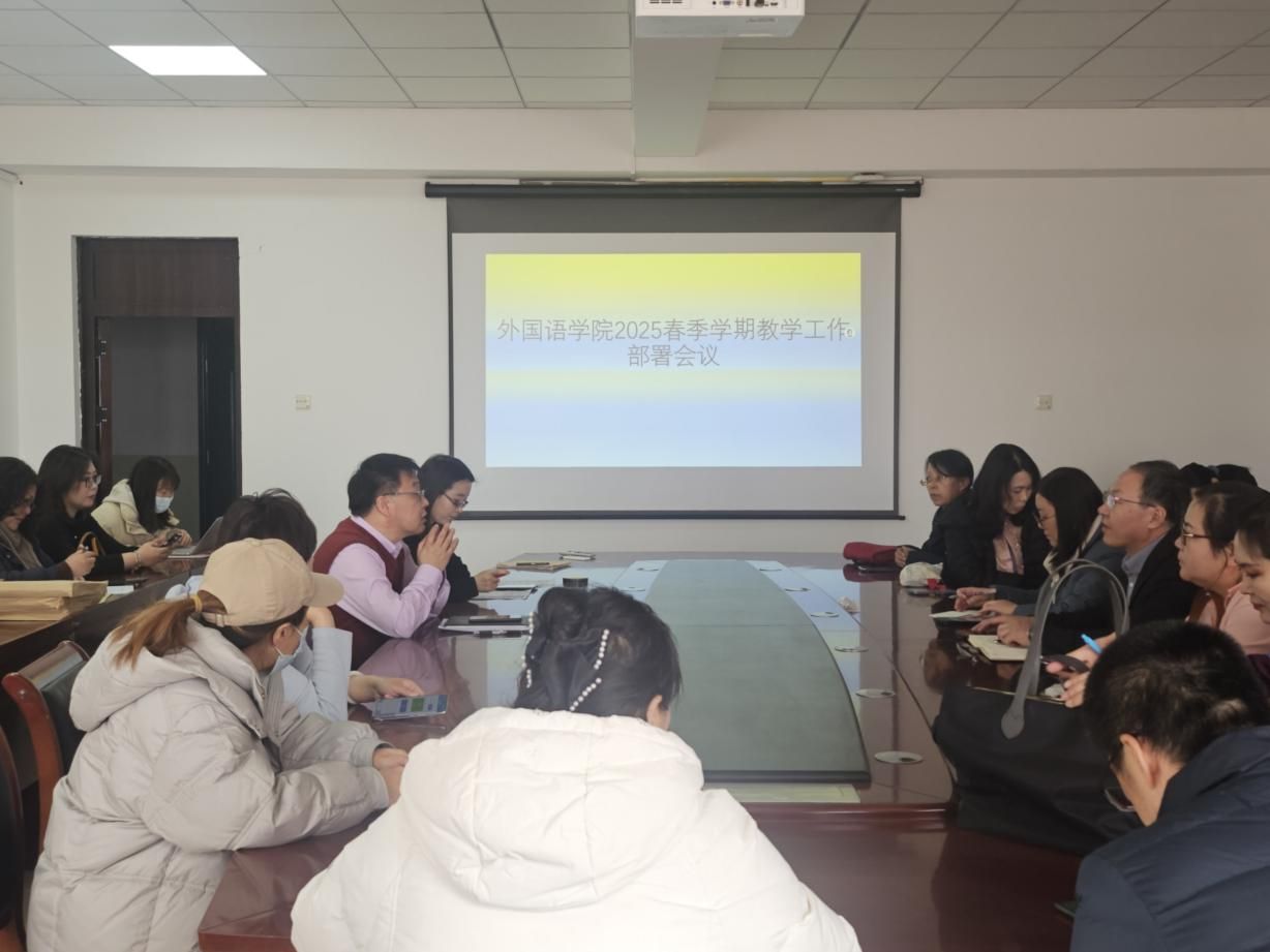 为全面贯彻落实学校教育教学工作精神,扎实推进新学期教学任务,外国语学院于2月25日召开了2025年春季学期教学工作部署会议。会议由秦红喜院长主持,全体教师参会。会议明确了新学期的教学重点工作任务和目标,为新学期的教学工作指明了方向。