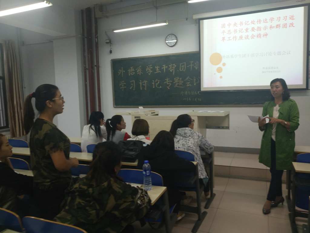 2017年8月31日晚7时,外语系团总支在都林楼109召开学生干部、团干部学习讨论专题会议,学习习近平总书记重要指示和群团改革工作座谈会精神,会议由外语系团总支负责人王春梅老师主持,外语系全体学生干部、团干部参加了此次会议。