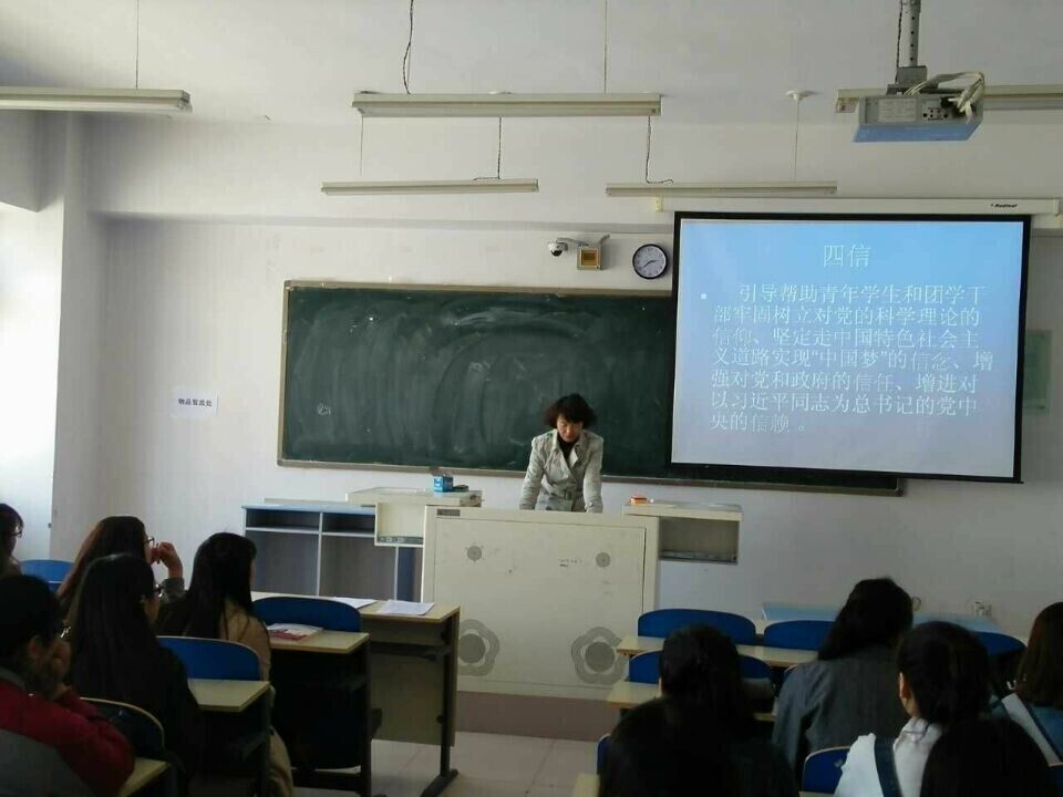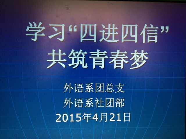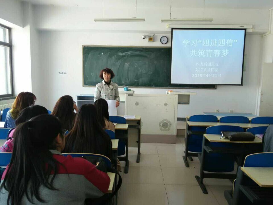为加强思想政治引领工作,深入贯彻习近平总书记系列重要讲话精神,外语系团总支于2015年4月21日中午在新教学楼610教室召开了“学习‘四进四信’共筑青春梦”主题座谈会。外语系团总支负责人王春梅老师及外语系艺术团、志愿者协会、演讲协会、外语协会、棋类协会、户外运动协会、书法协会、职业发展协会等社团、协会共40余人参加了本次座谈会。