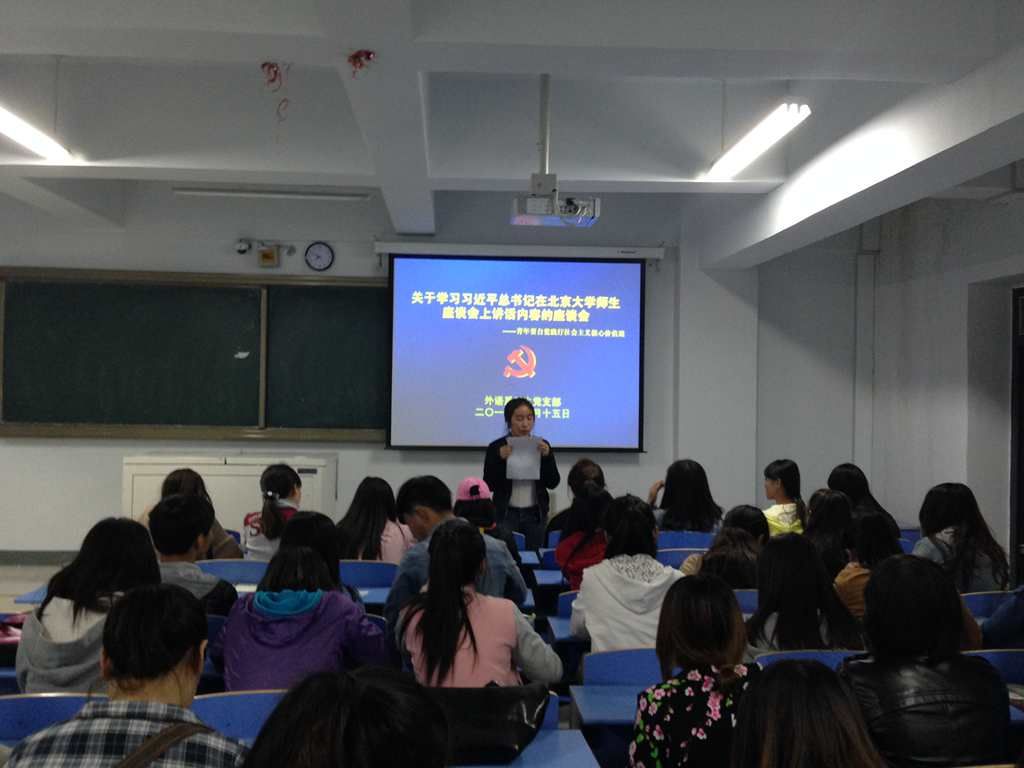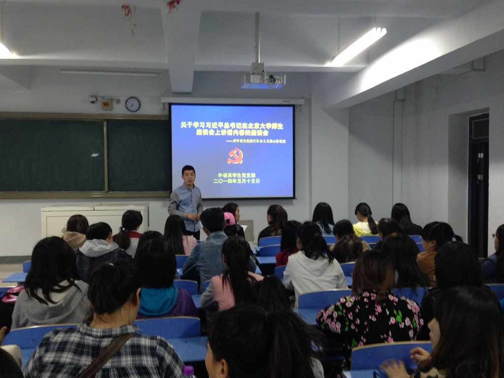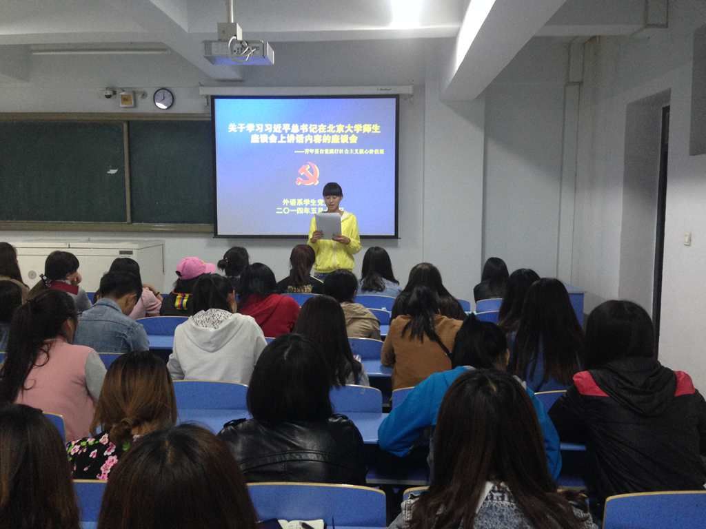 2014年5月15日晚,外语系团总支、学生党支部组织40名学生党员及团学干部,在618教室学习了习近平总书记在北京大学师生座谈会上的讲话精神。