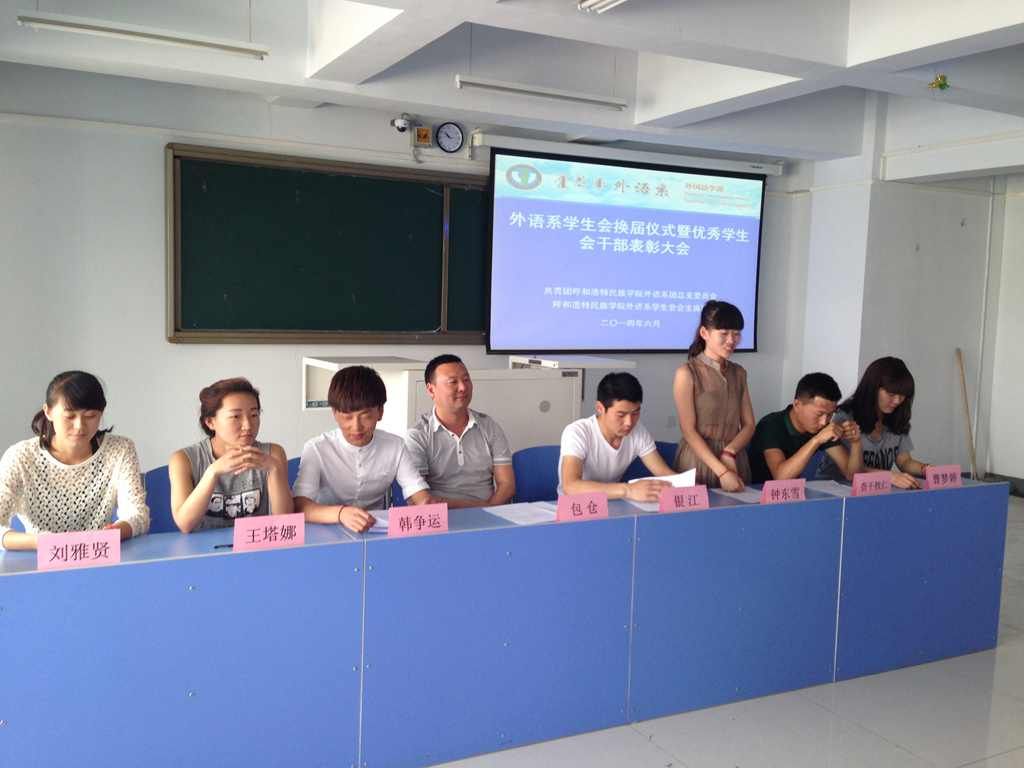 2014年6月3日中午,外语系召开学生会换届暨优秀学生会干部表彰大会。团总支书记包仓、第二届学生会主要学生干部、第三届学生会全体成员和各班级班长、团支部书记近60人参加了会议。会议由团总支委员曹梦婷主持。