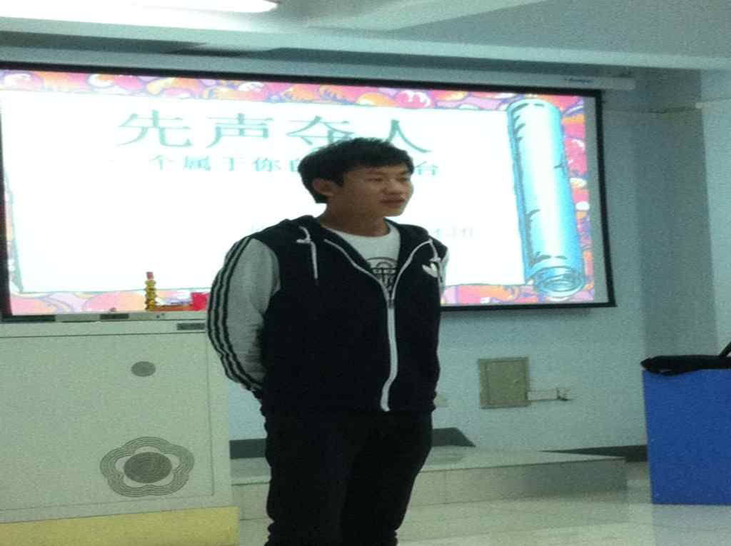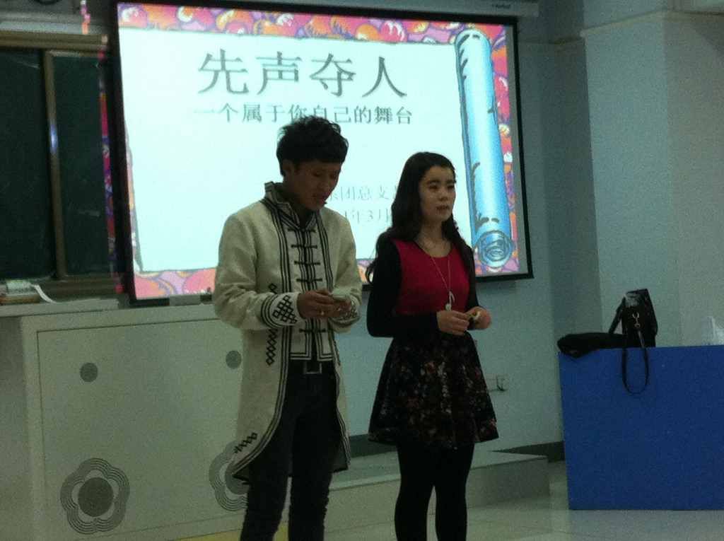 为展示大学生文艺才华,丰富同学们课余文化生活,2014年3月22日晚7:30,由外语系团总支主办,大学生艺术团承办的“先声夺人”歌唱比赛活动在618教室举行。
