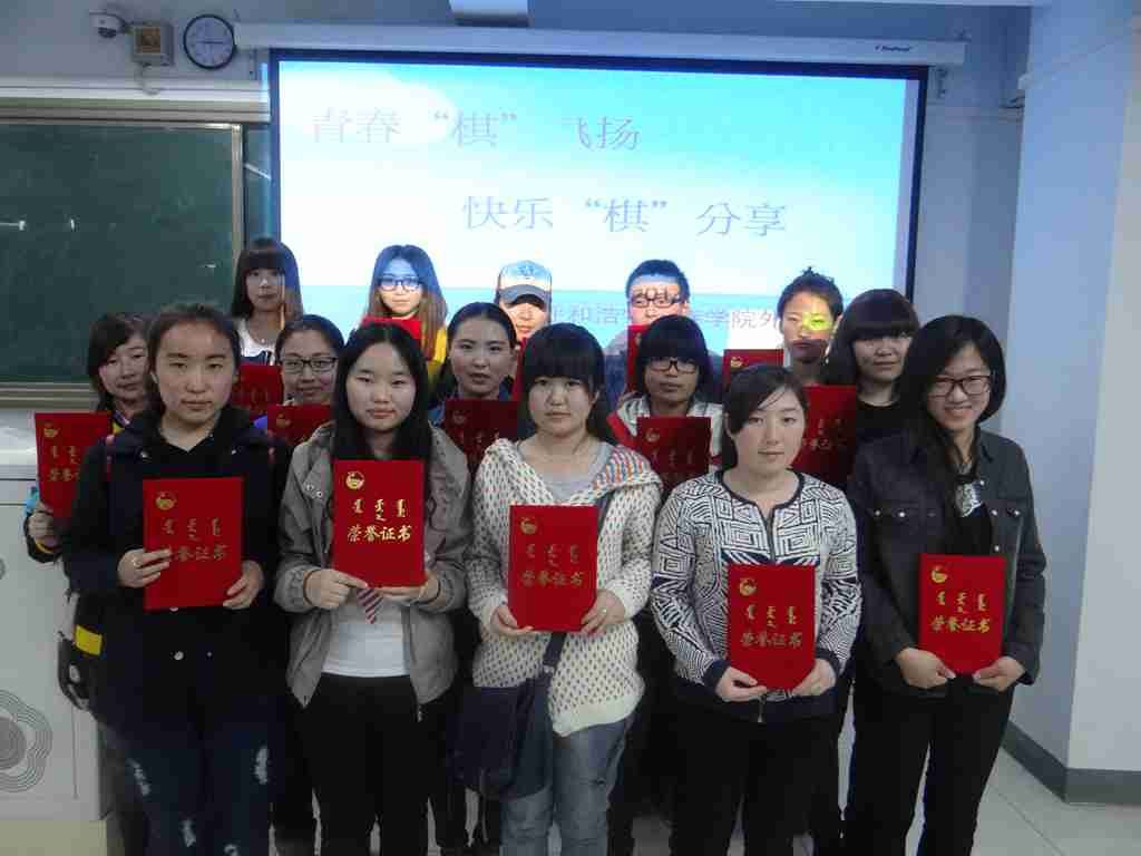为丰富同学们的课外娱乐生活,弘扬中华民族传统文化,培养同学们健康的爱好,锻炼同学们的思维能力,2014年4月3日晚7:30,外语系团总支在新教学楼618教室举办了“青春棋飞扬,快乐棋分享”大学生棋类比赛,近200名选手参加本次比赛,经过紧张激烈的5轮赛事,最终评选出五子棋和跳棋比赛的一、二、三等奖以及优秀奖。具体获奖名单公布如下:
