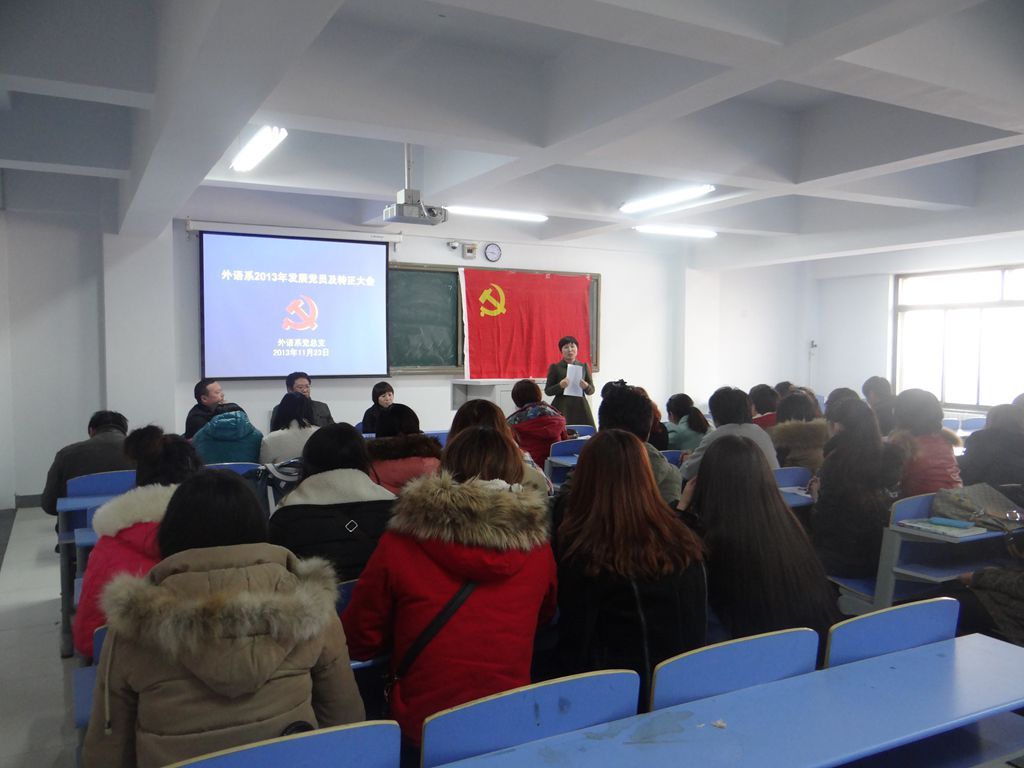 为推进党的群众路线教育实践活动,2013年11月23日下午3:30-4:30,外语系党总支在新教学楼602教室召开了外语系下半年发展党员、转正党员大会和新党员入党宣誓仪式。