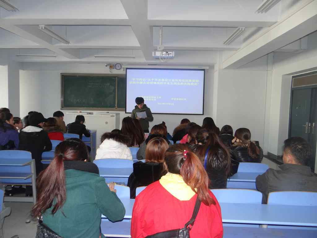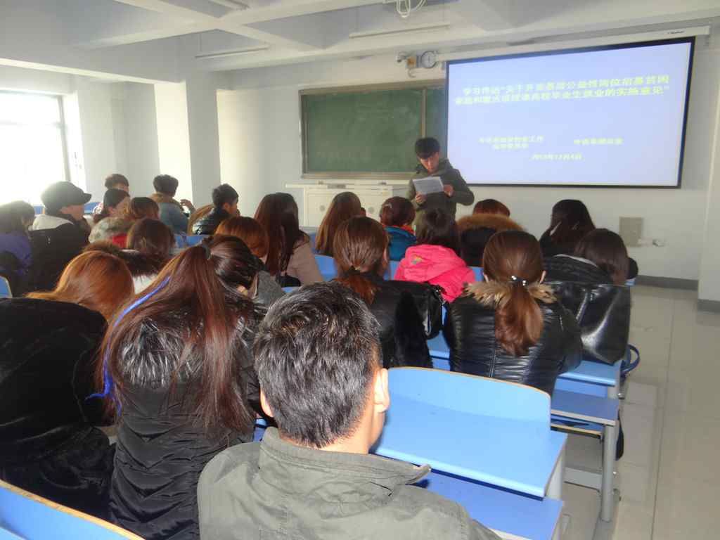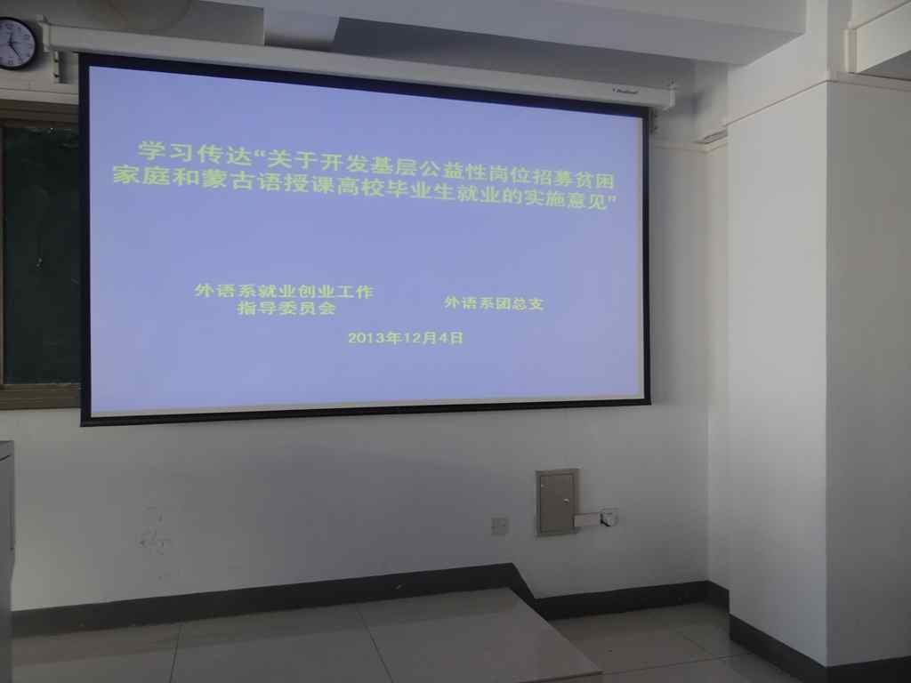 2013年12月4日中午12点10分,外语系就业创业工作指导委员会在新教学楼618教室组织全系蒙语授课班主要学生干部,举办了“政策下基层,关爱大家庭”主题宣传活动,重点传达学习了由内蒙古自治区人力资源和社会保障厅及内蒙古自治区财政厅下发的《开发基层公益性岗位招募贫困家庭和蒙古语授课高校毕业生就业的实施意见》,并发放了宣传材料,并进行了广泛宣传动员工作。