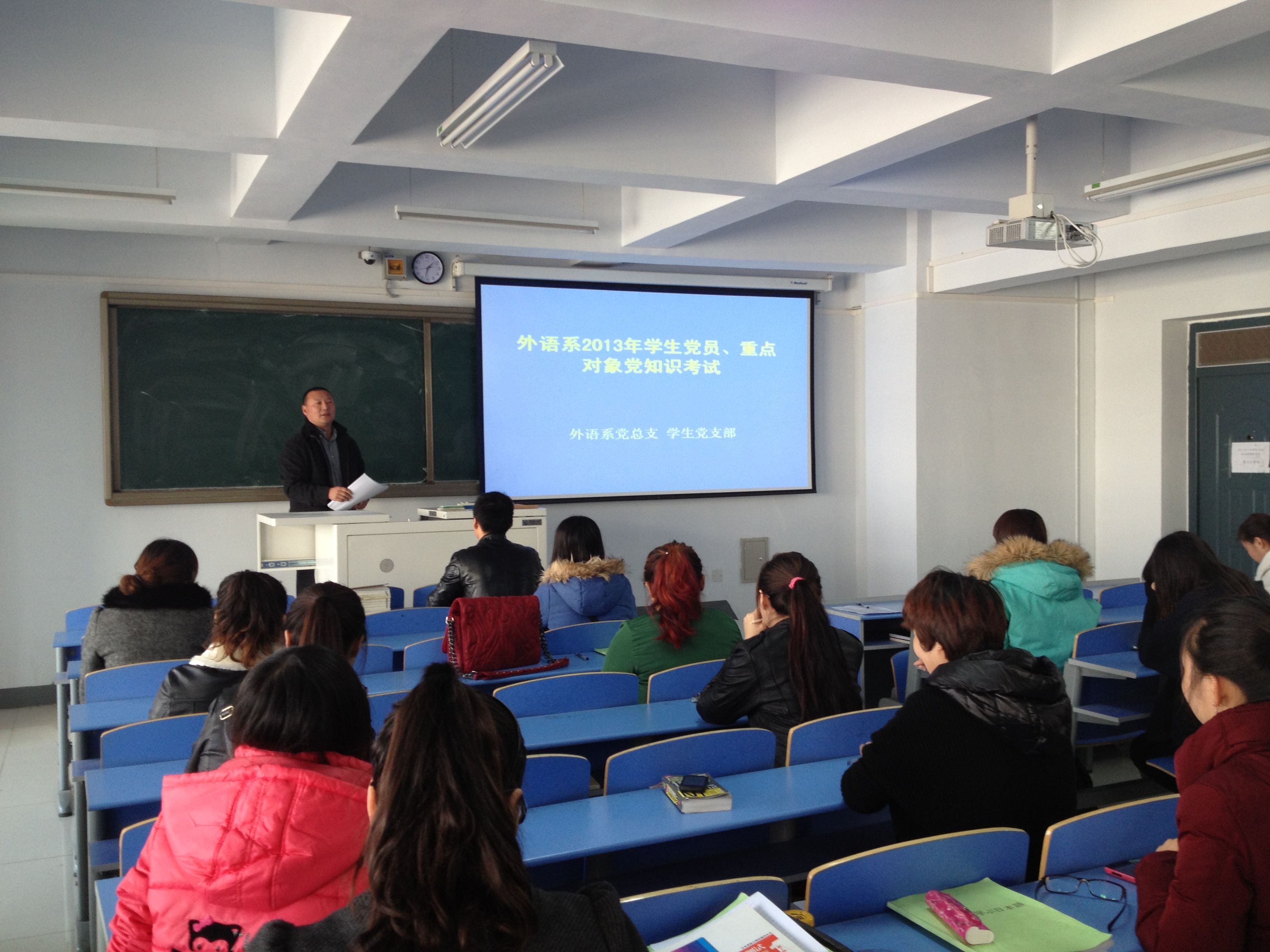 为了检验学生党员、重点培养理论知识的学习水平,2013年11月5日中午,外语系学生党支部在新教学楼618教室组织学生党员、重点对象共80人进行了理论考试。