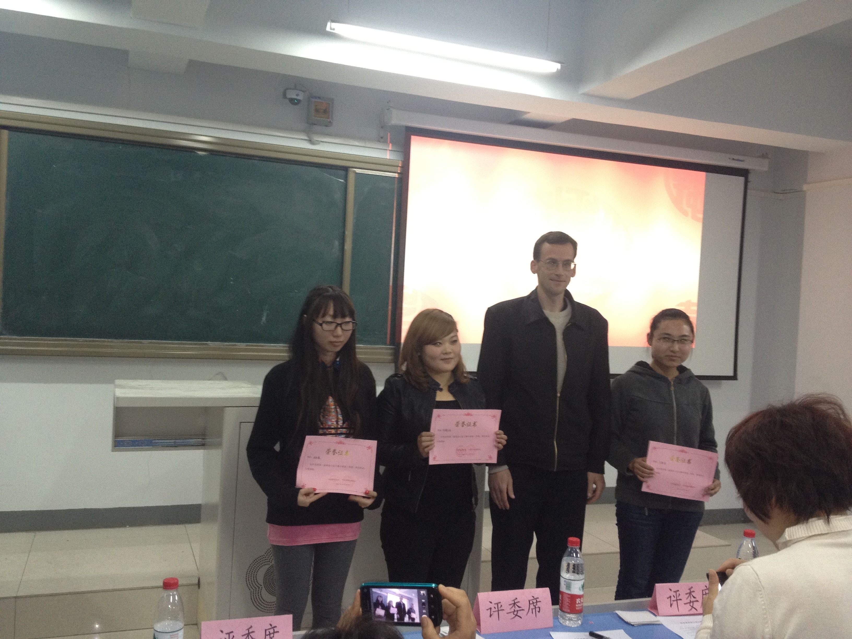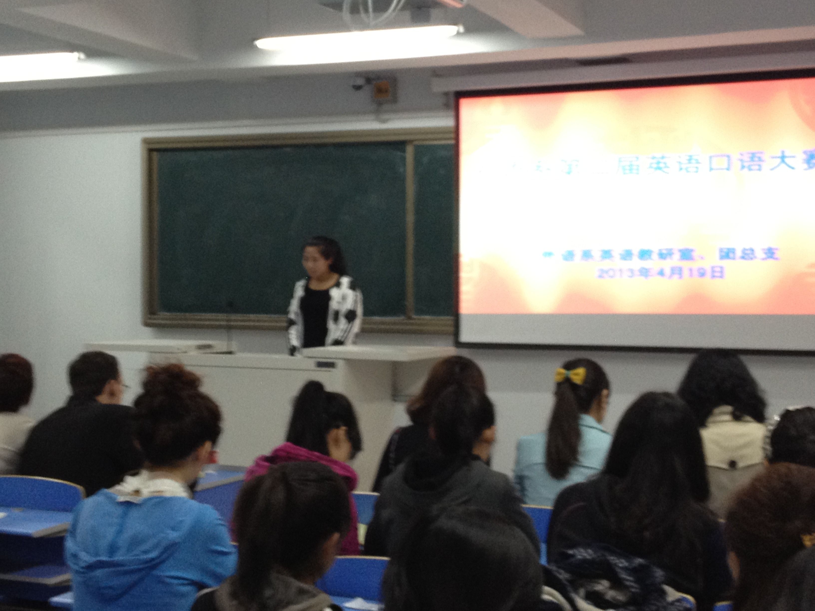 为提高学生的英语口语水平,丰富课余生活,2013年4月19日,外语系团总支、英语教研室在新教学楼618教室举行了第二届英语口语大赛。