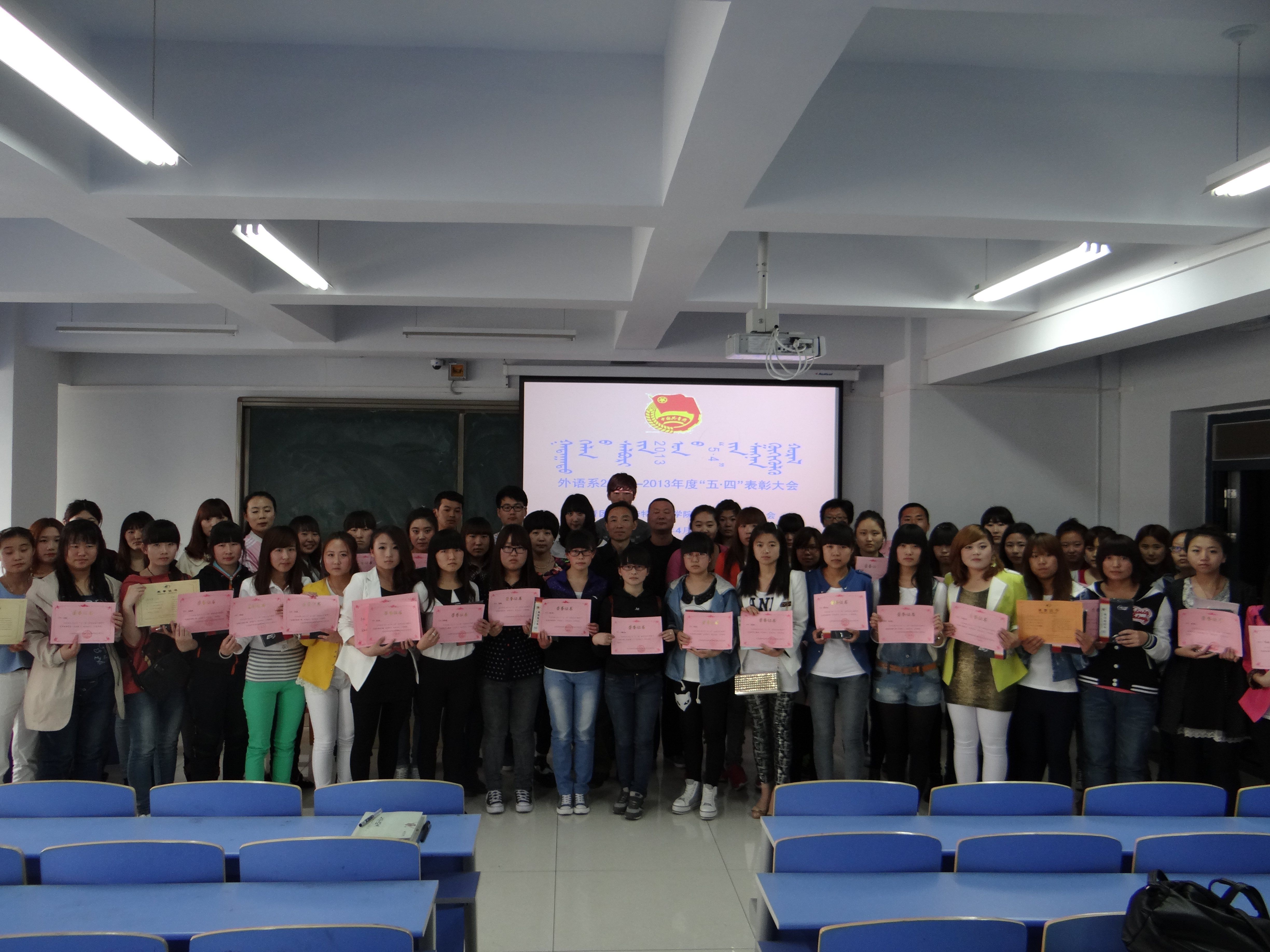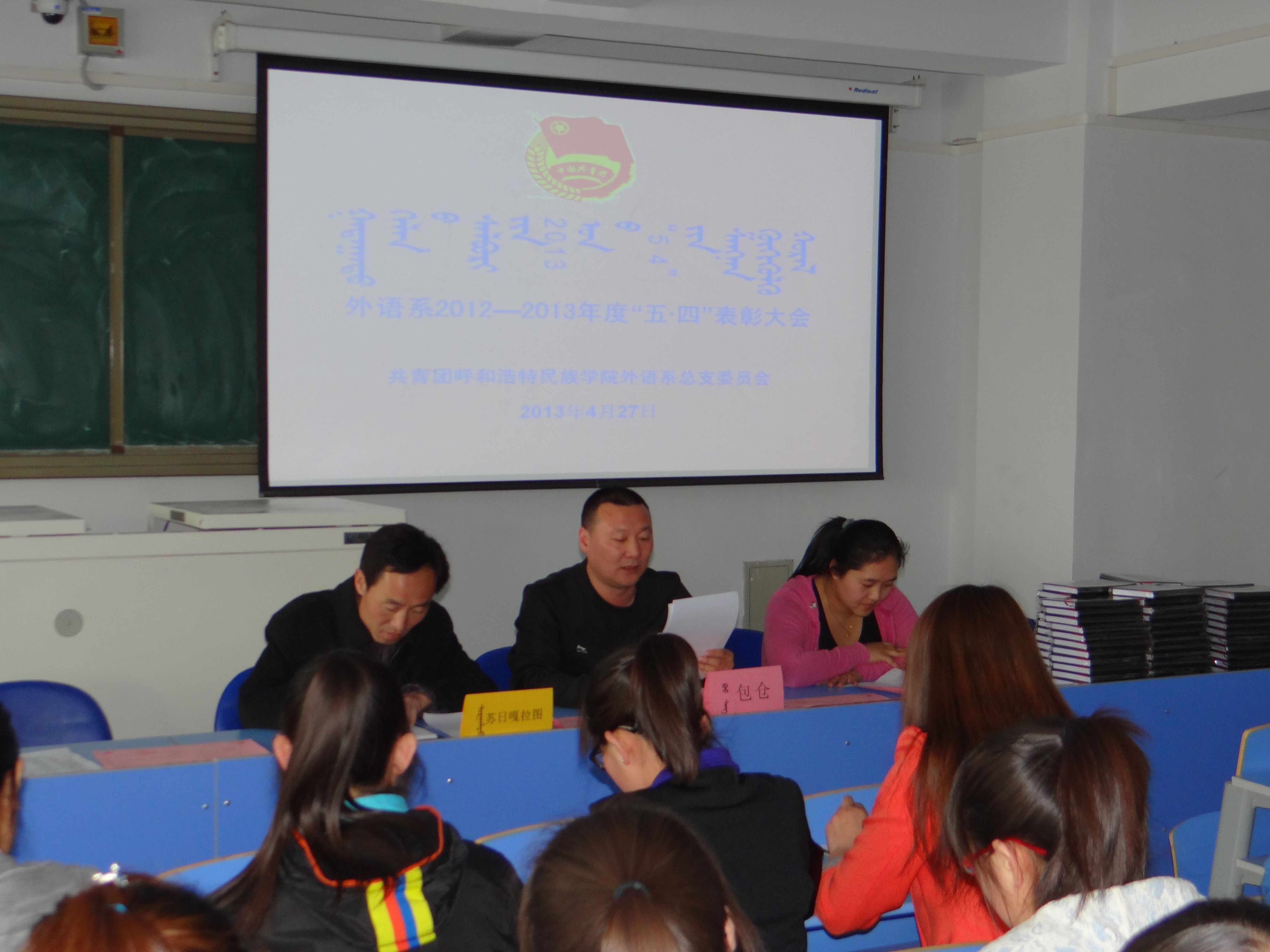 2013年4月27日下午,外语系2013年“五四”表彰大会在新教学楼618教室举行。外语系副主任苏日嘎拉图教授、团总支书记包仓、团总支助理高帆以及学生代表出席了本次大会。
