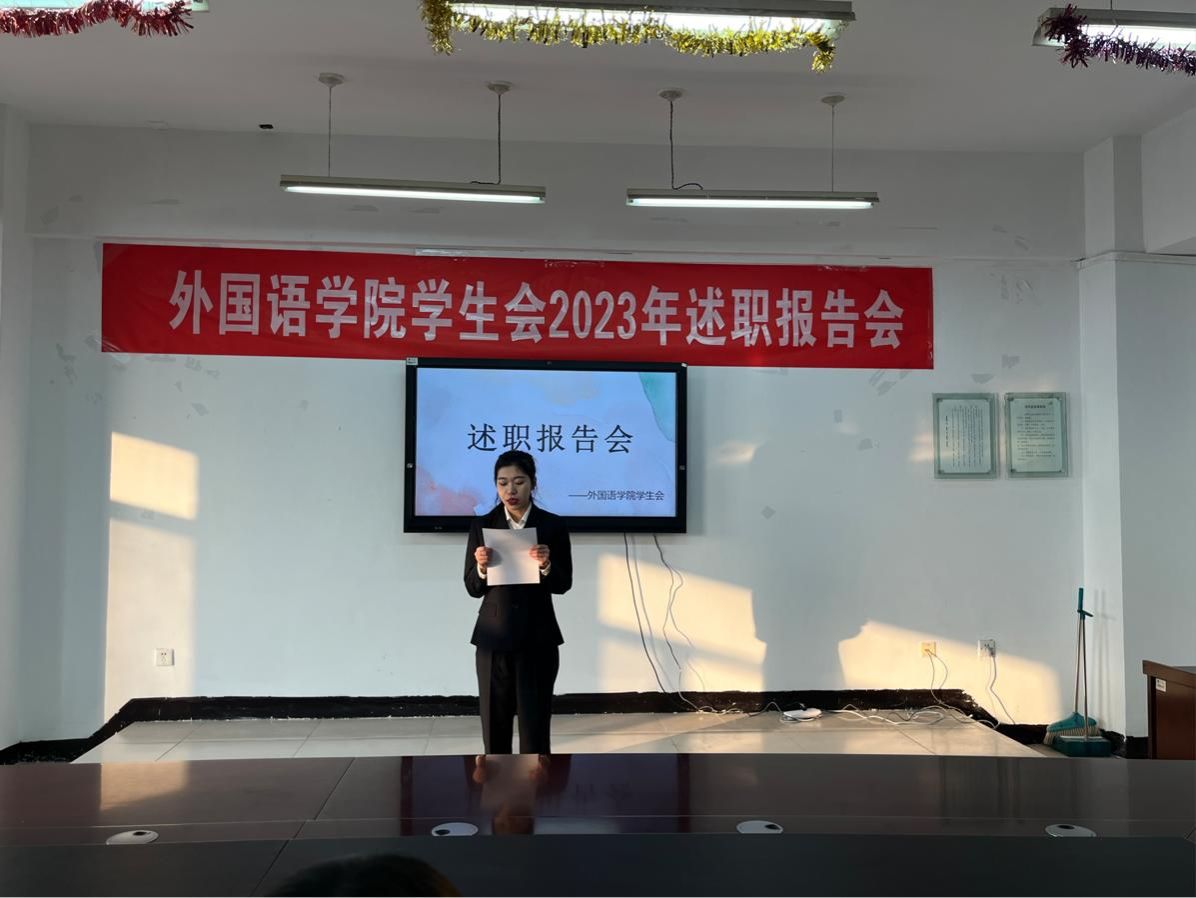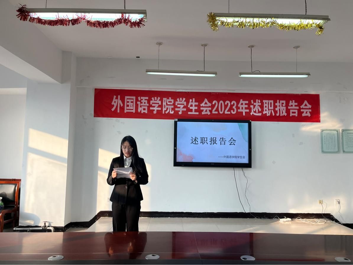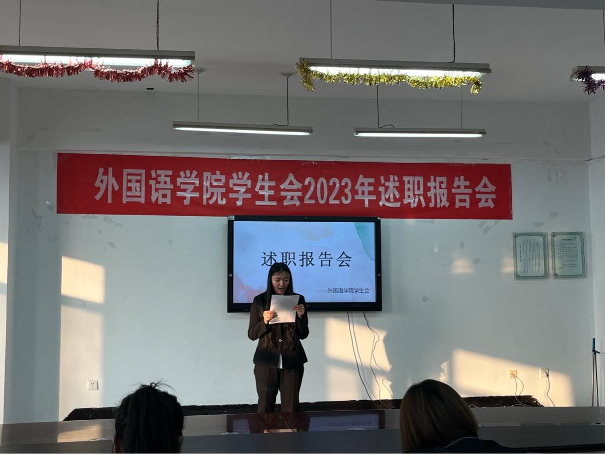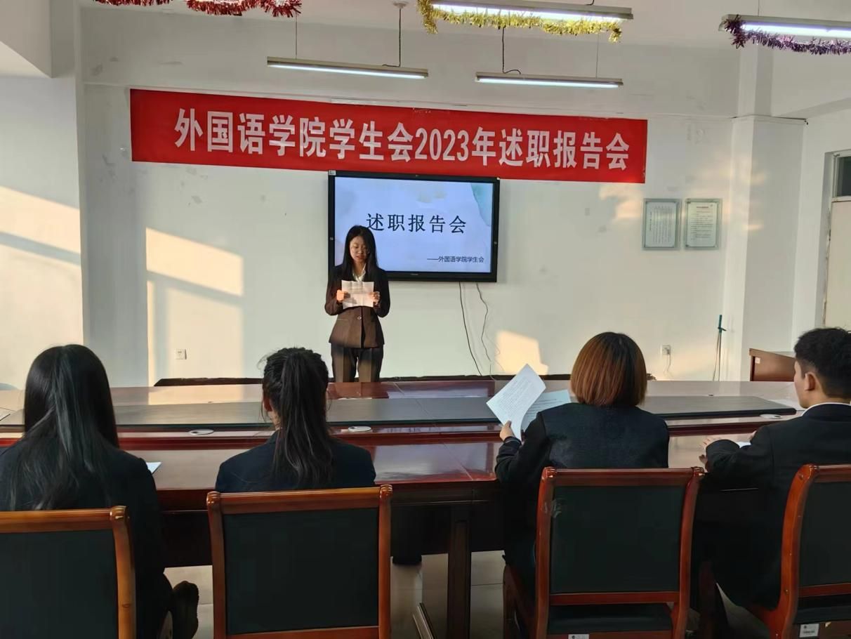 时光荏苒,岁月如梭。为深入学习贯彻习近平新时代中国特色社会主义思想,进一步加强学生干部队伍建设,增强外国语学院学生会的建设引领力和组织服务力,促进学生会工作的高质量发展,外国语学院团总支于12月28日上午在都林楼611会议室召开学生会2023年度工作述职报告会。学院团总支书记雷旭平、学生会主席张衍旭、学生会部长及学生会成员代表参加会议。