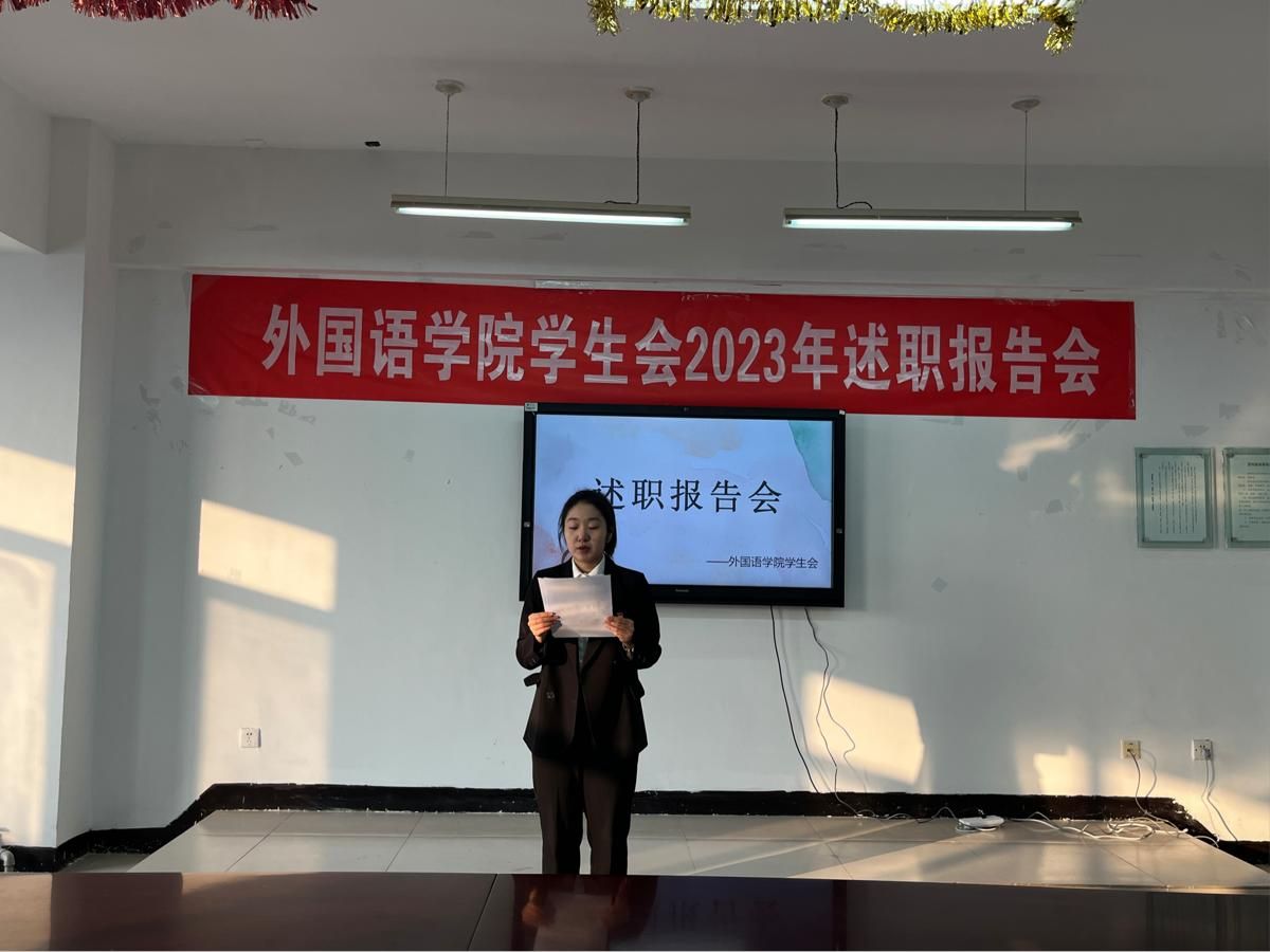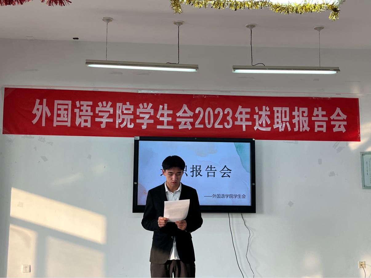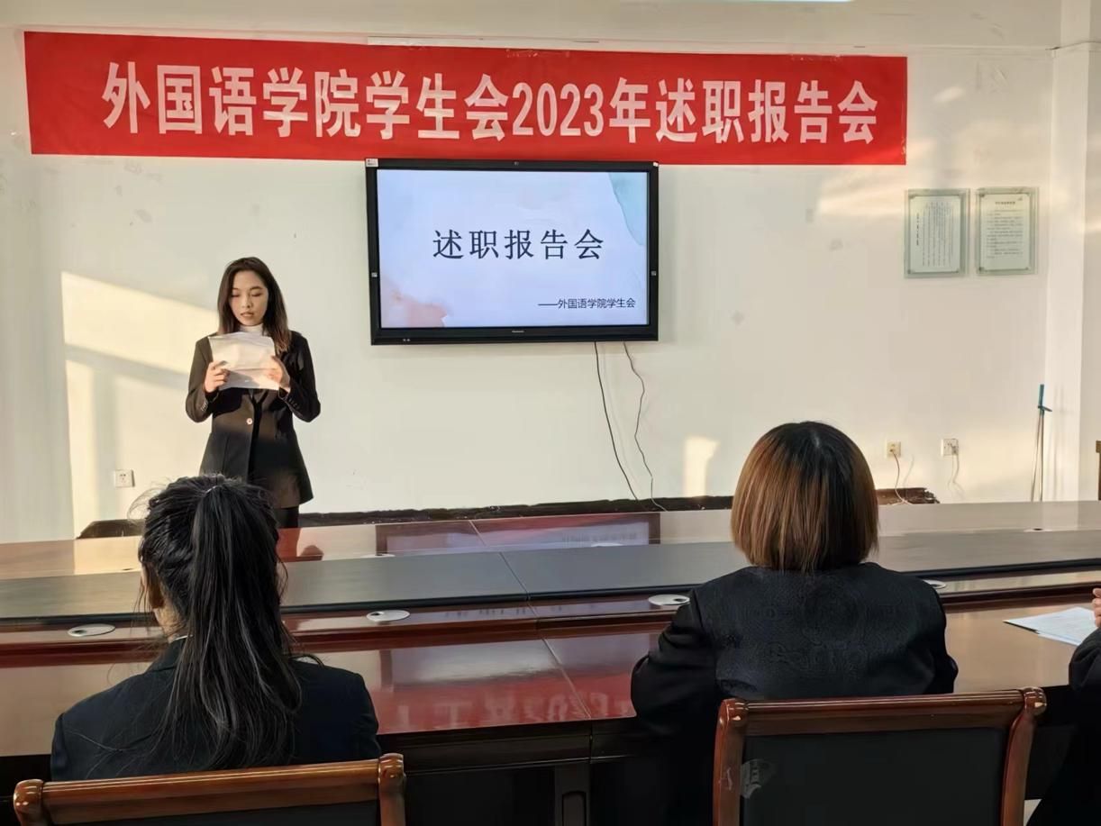 时光荏苒,岁月如梭。为深入学习贯彻习近平新时代中国特色社会主义思想,进一步加强学生干部队伍建设,增强外国语学院学生会的建设引领力和组织服务力,促进学生会工作的高质量发展,外国语学院团总支于12月28日上午在都林楼611会议室召开学生会2023年度工作述职报告会。学院团总支书记雷旭平、学生会主席张衍旭、学生会部长及学生会成员代表参加会议。