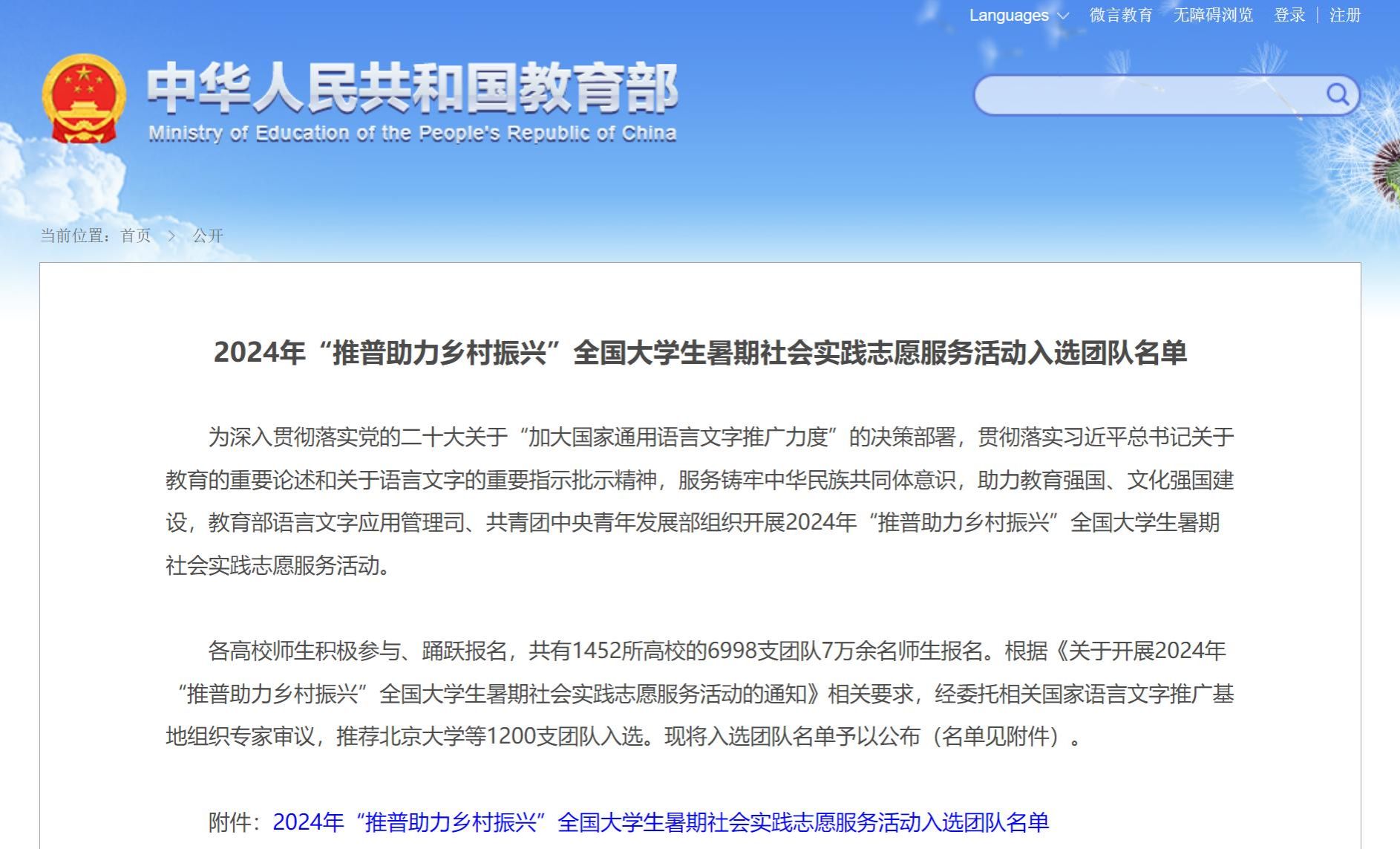 为深入贯彻落实党的二十大关于“加大国家通用语言文字推广力度”的决策部署,贯彻落实习近平总书记关于教育的重要论述和关于语言文字的重要指示批示精神,服务铸牢中华民族共同体意识,助力教育强国、文化强国建设,教育部语言文字应用管理司、共青团中央青年发展部组织开展了2024年“推普助力乡村振兴”全国大学生暑期社会实践志愿服务活动。