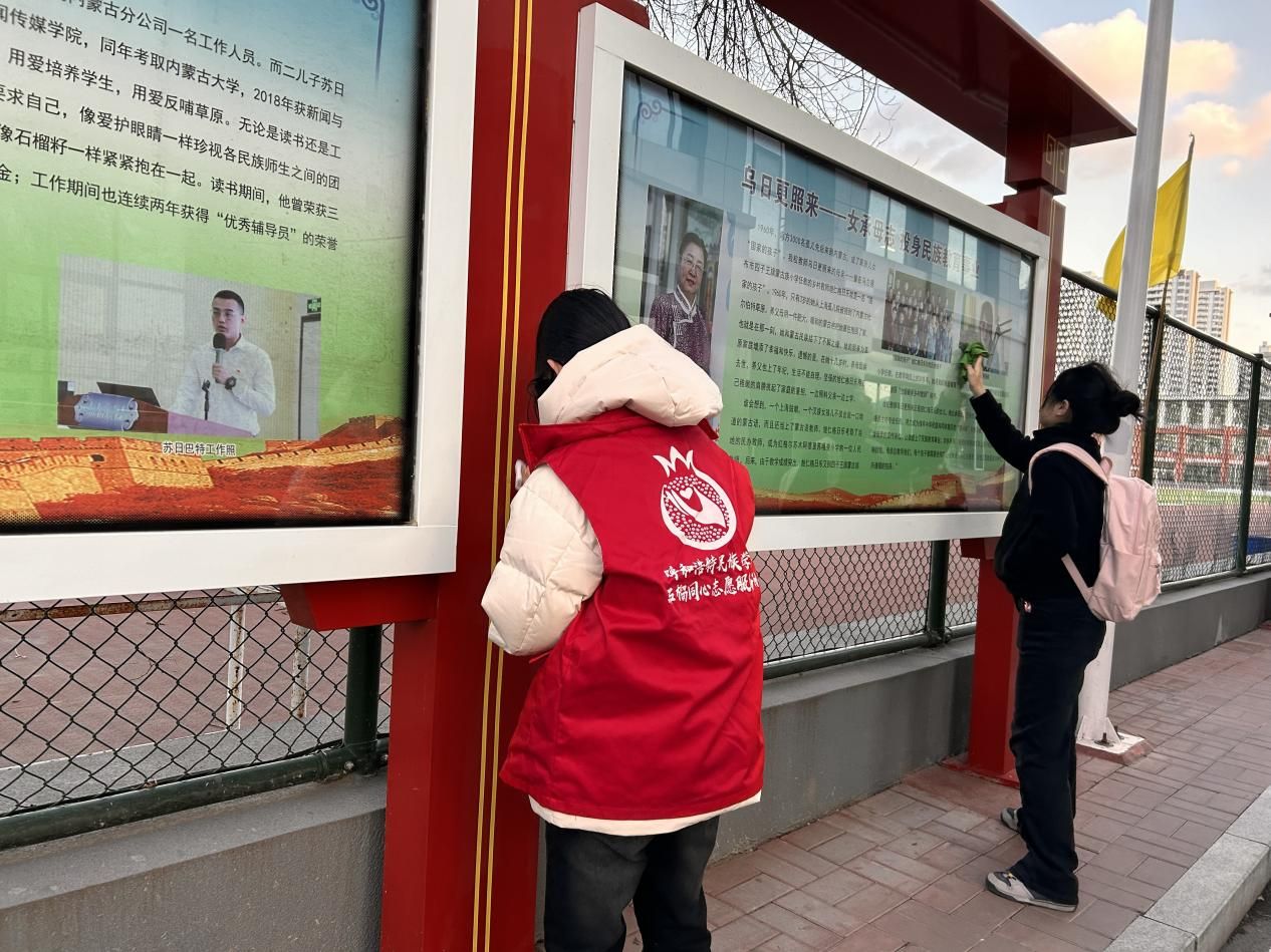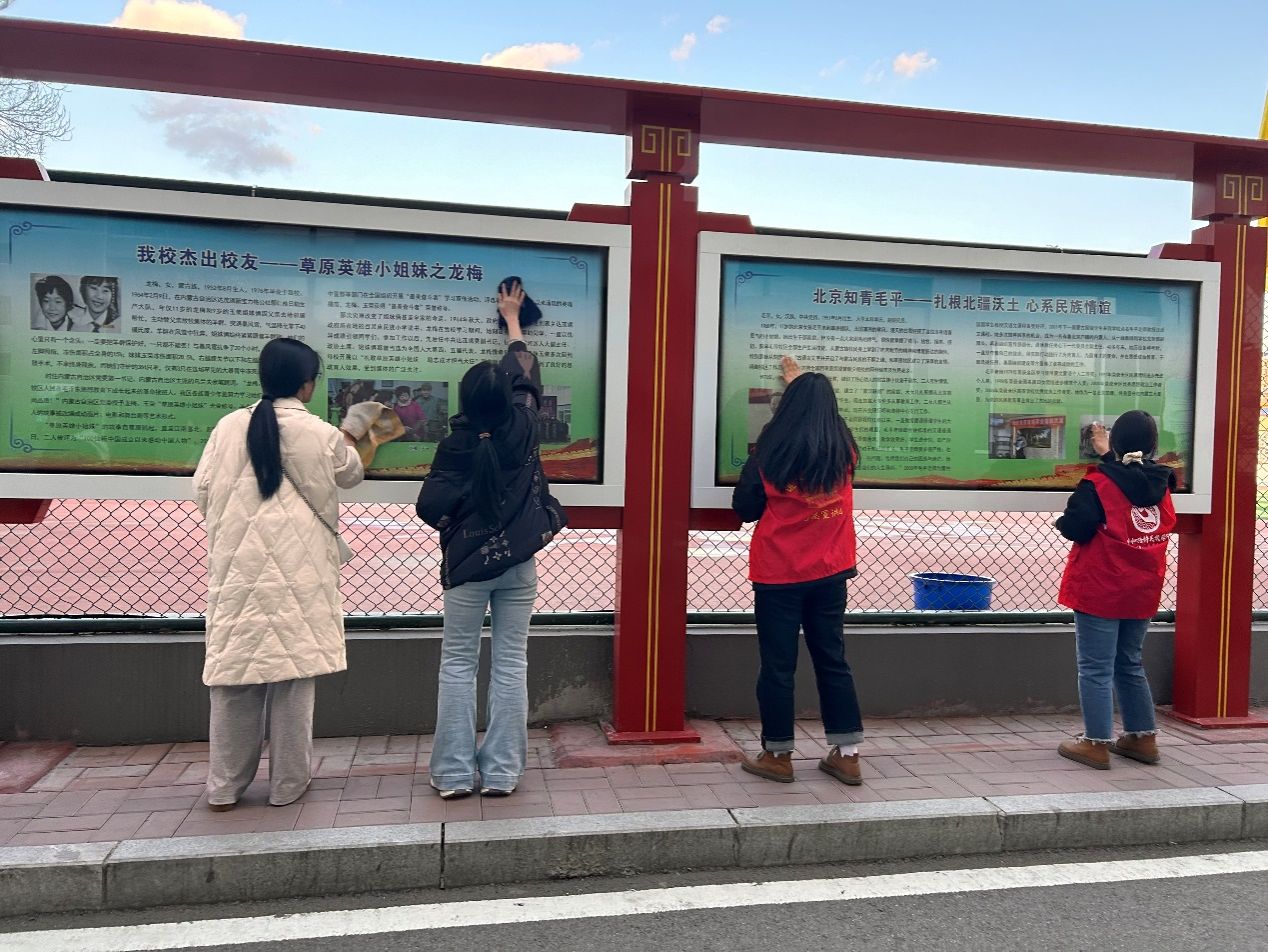 活动前夕,两个党支部的全体学生党员积极响应号召,认真筹备,确保活动顺利进行。活动当天,党员们准时集合于学校民族团结进步文化长廊,身着红色志愿者马甲,手持清洁工具,以饱满的热情投入到清洁工作中。在活动中,党员们分工明确,协作有序,对全部橱窗进行全方位、无死角擦拭。尽管任务繁重,但党员们发扬不怕脏、不怕累的精神,用实际行动展现了党员的风采。