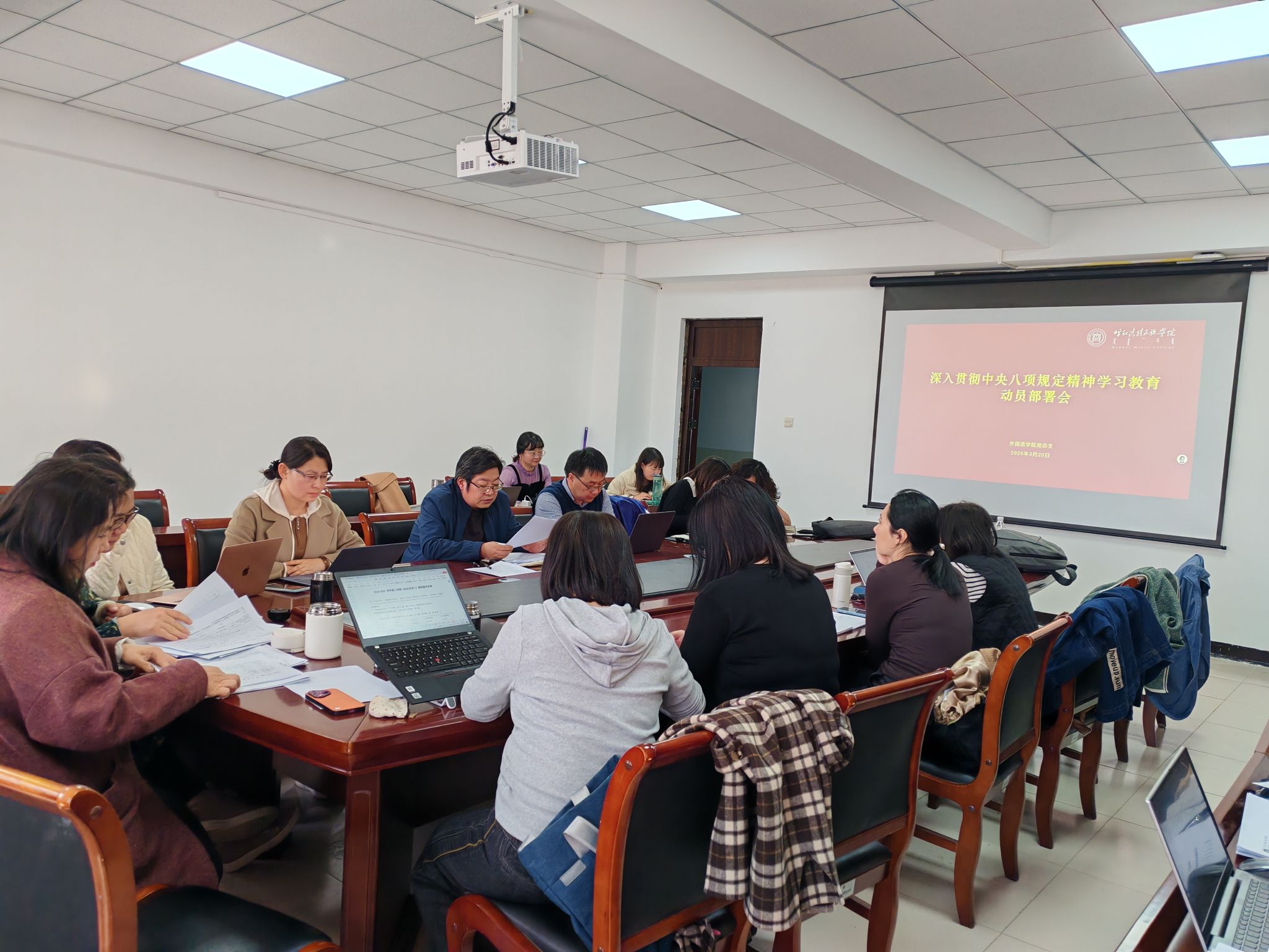 3月20日下午,外国语学院在学院会议室召开了深入贯彻中央八项规定精神学习教育动员部署会,学院党总支委员、各党支部书记、全体教师党员参加会议。会议由党总支书记朱俊杰主持。