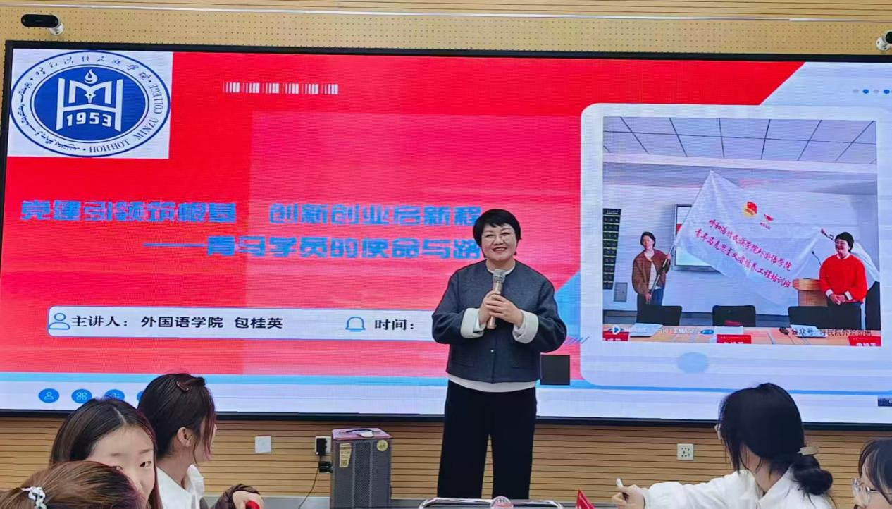 为锚定青马工程核心定位,强化外国语专业学子理论铸魂与价值引领,筑牢理想信念根基,11月4日,外国语学院党总支副书记包桂英为学院2025年“青马班”学员讲授题为《党建引领筑根基 创新创业启新程——青马学员的使命与路径》的培训第三课。