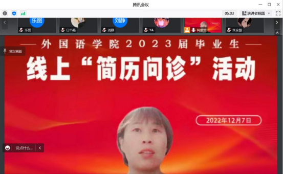 为更好地进行就业指导,提供就业帮助,提高学生的求职能力和简历制作能力,促进学生就业工作,外国语学院于12月7日晚7时通过腾讯会议平台举办2023届毕业生线上“简历问诊”活动。