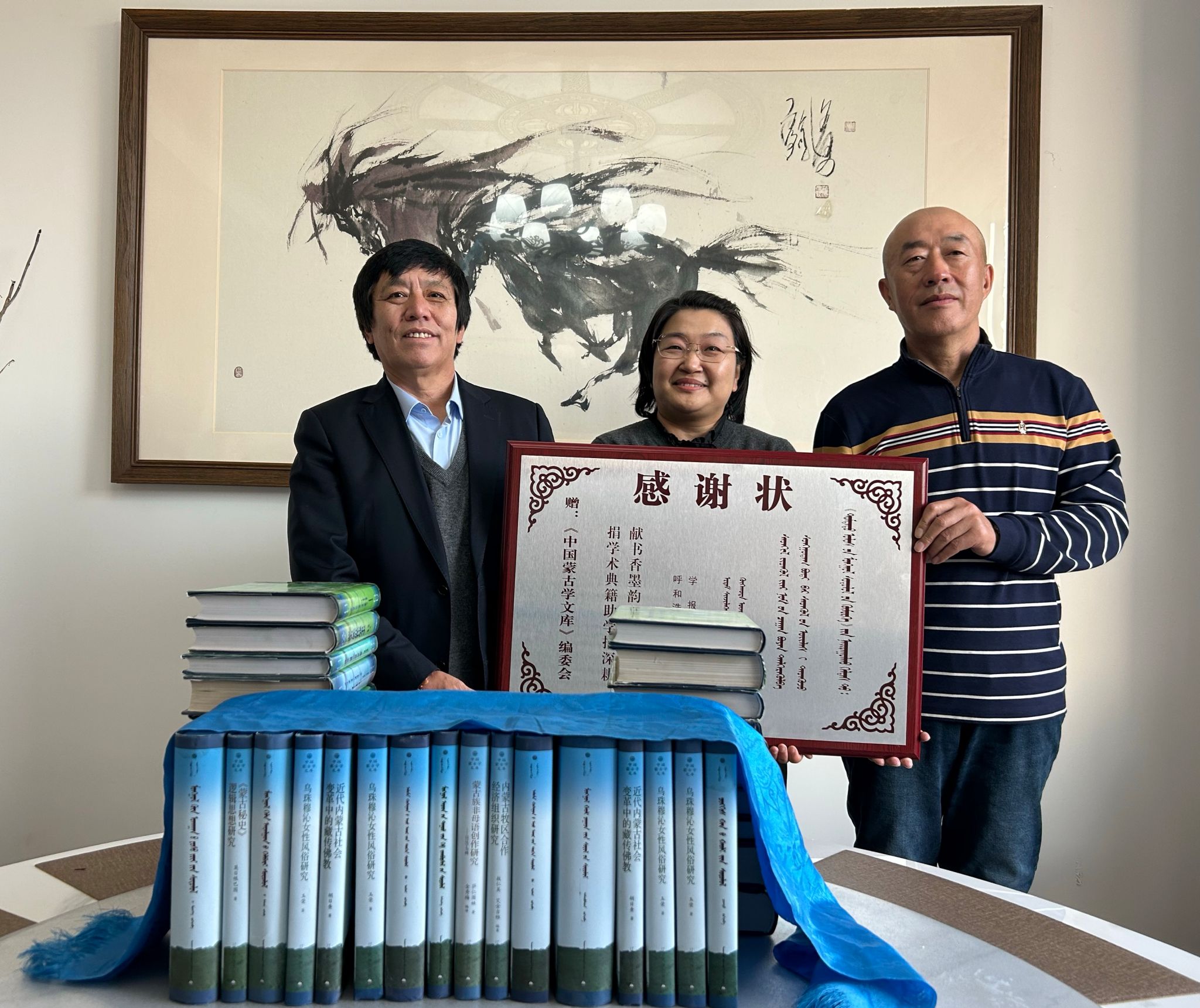 2025年11月3日,学报编辑部收到了《中国蒙古学文库》编委会赠送的《中国蒙古学文库》两批丛书,总计200册专著。《中国蒙古学文库》编委会的负责人和学报编辑们共同参与此次捐书活动。编辑部主任富涛接受了赠书,并对《中国蒙古学文库》编委会的慷慨捐赠表达了诚挚的感谢。这两批丛书是由《中国蒙古学文库》编委会编辑出版,汇集了蒙古学领域近20多年来的多项重要研究成果,具有极高的学术和收藏价值。