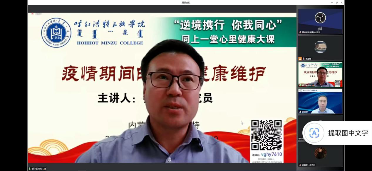 在喜迎党的二十大胜利召开之际,为筑牢 “疫情”防线,守卫校园平安,引导全校师生时刻保持积极乐观的健康心态,10月15日下午,学校以直播形式“云端”组织开展了“万名师生同上一堂心理健康大课”活动。活动由学校党委委员、教务处处长额尔敦布和主持。