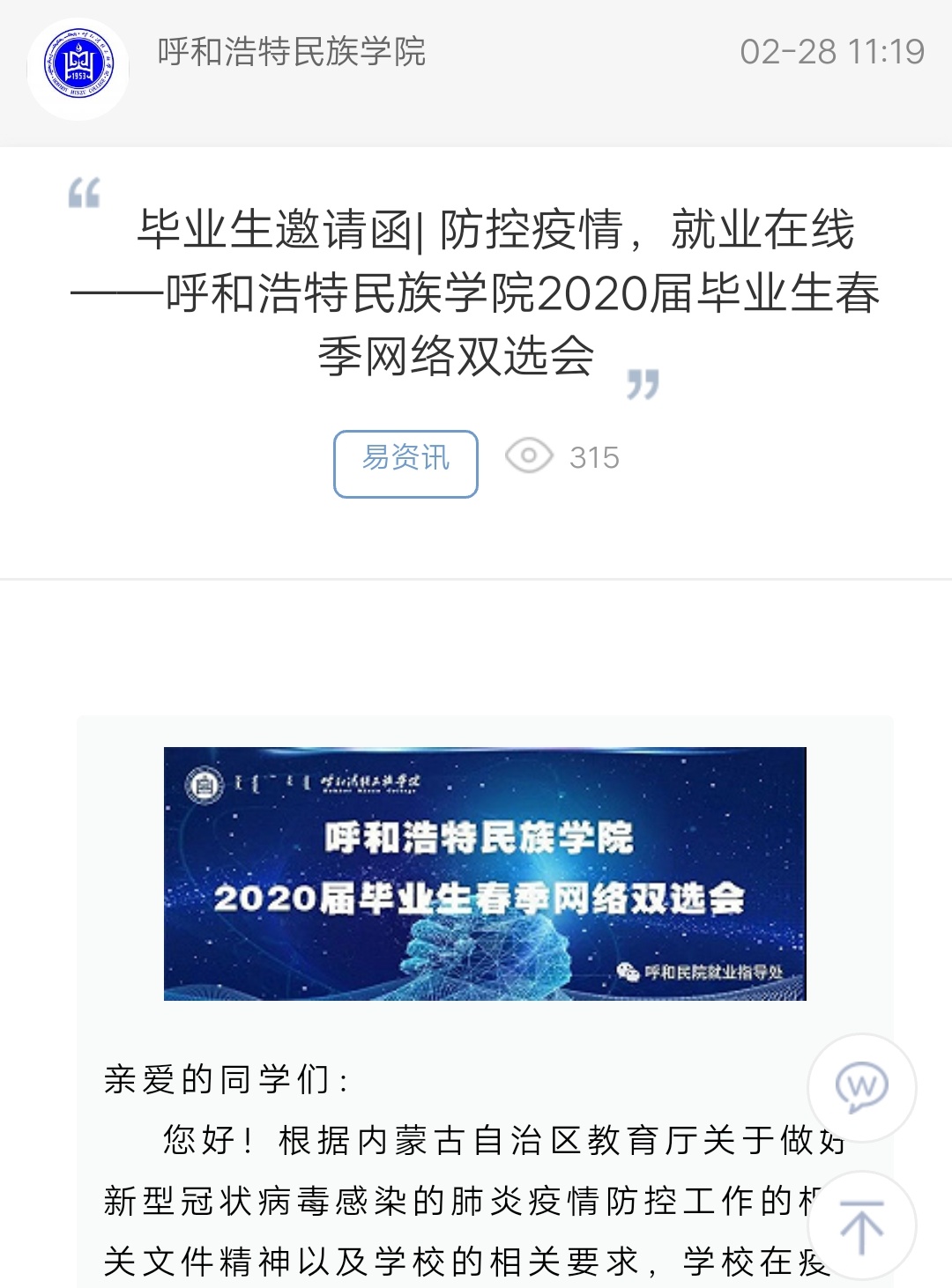 毕业生邀请函| 防控疫情,就业在线——MILE米乐集团2020届毕业生春季网络双选会