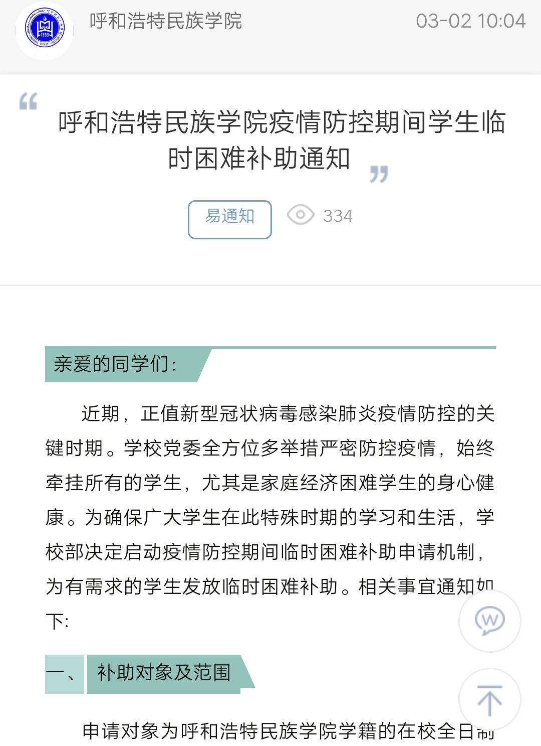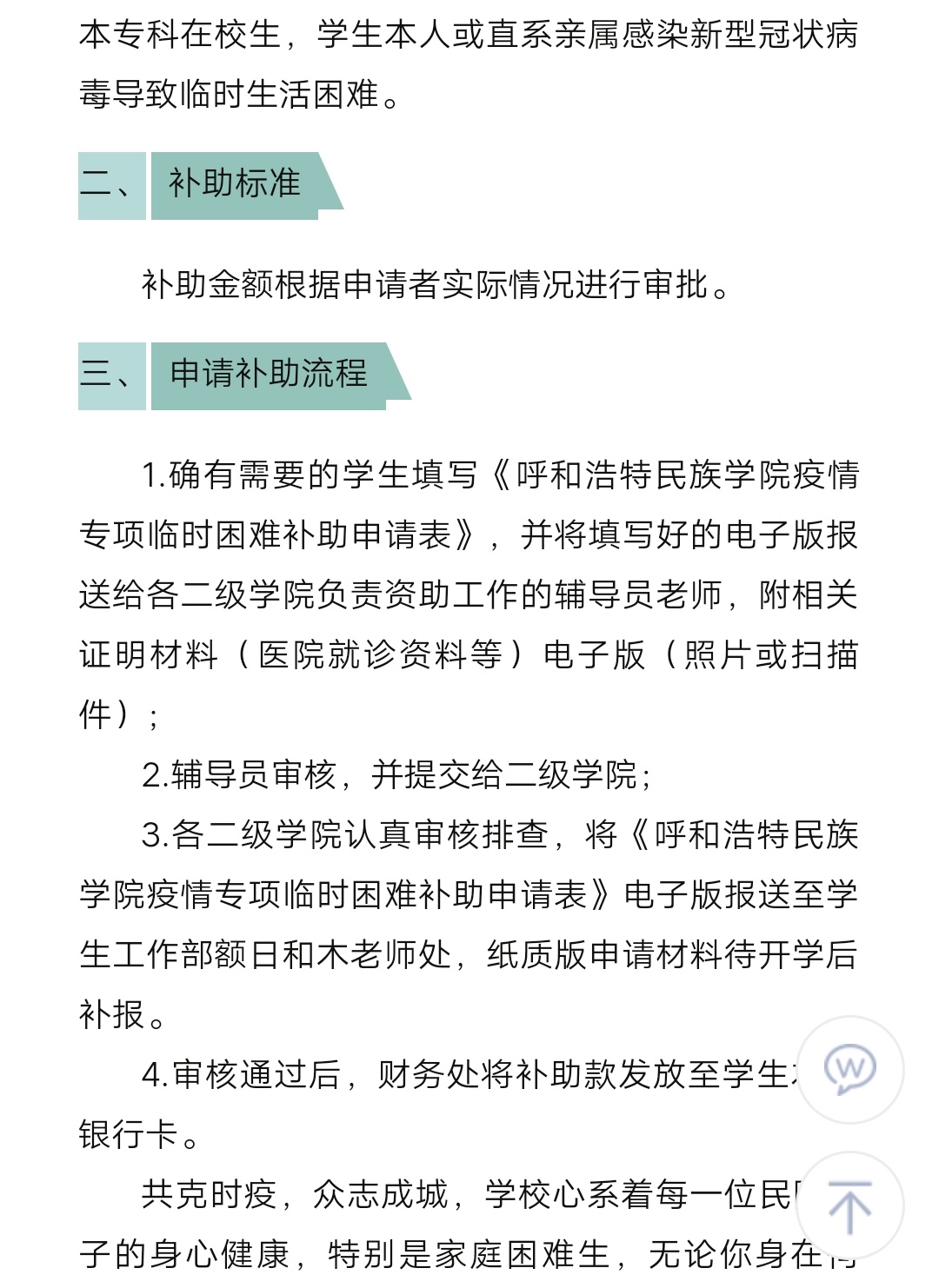 MILE米乐集团疫情防控期间学生临时困难补助通知