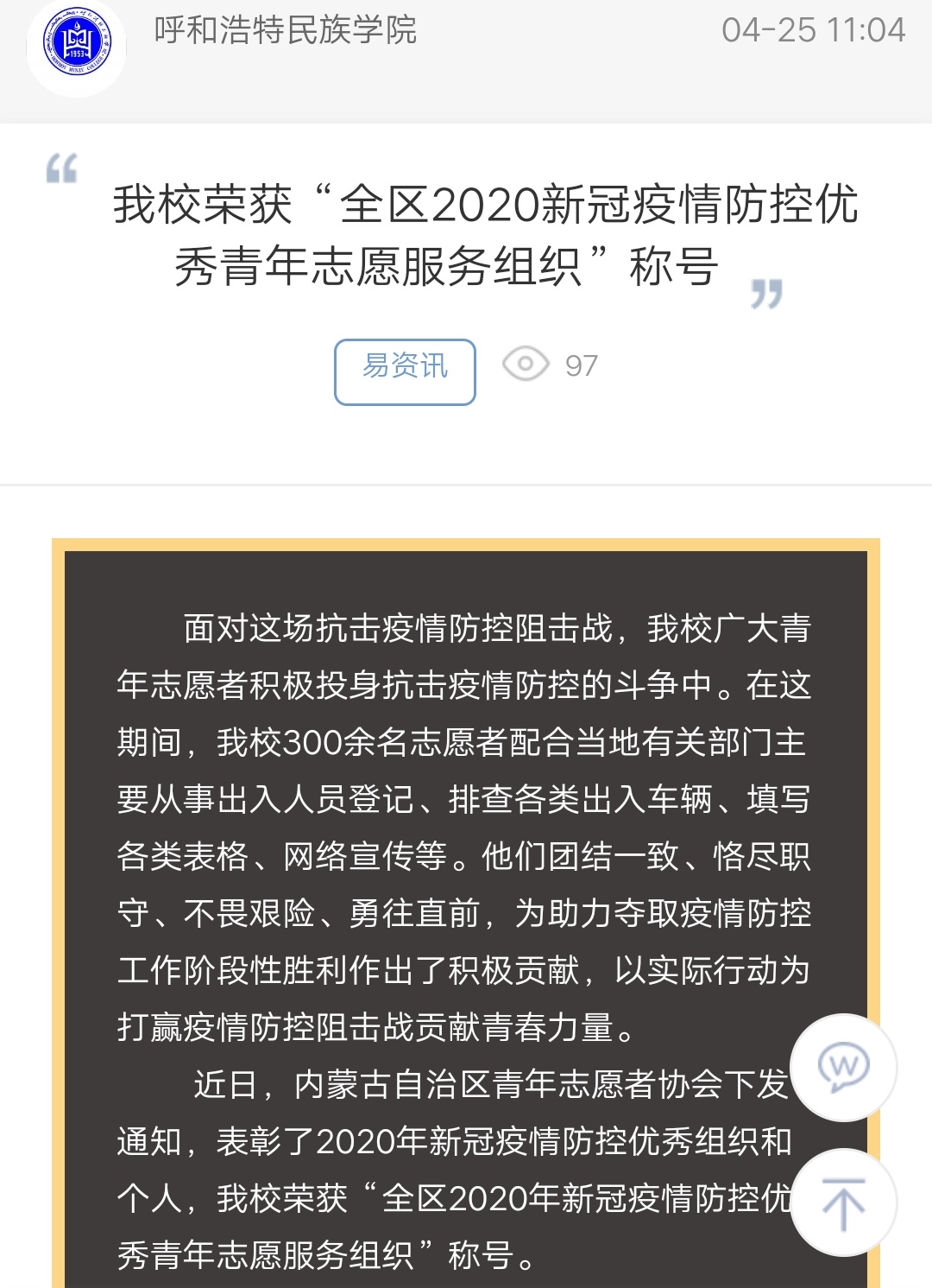 米乐官网荣获“全区2020新冠疫情防控优秀青年志愿服务组织”称号