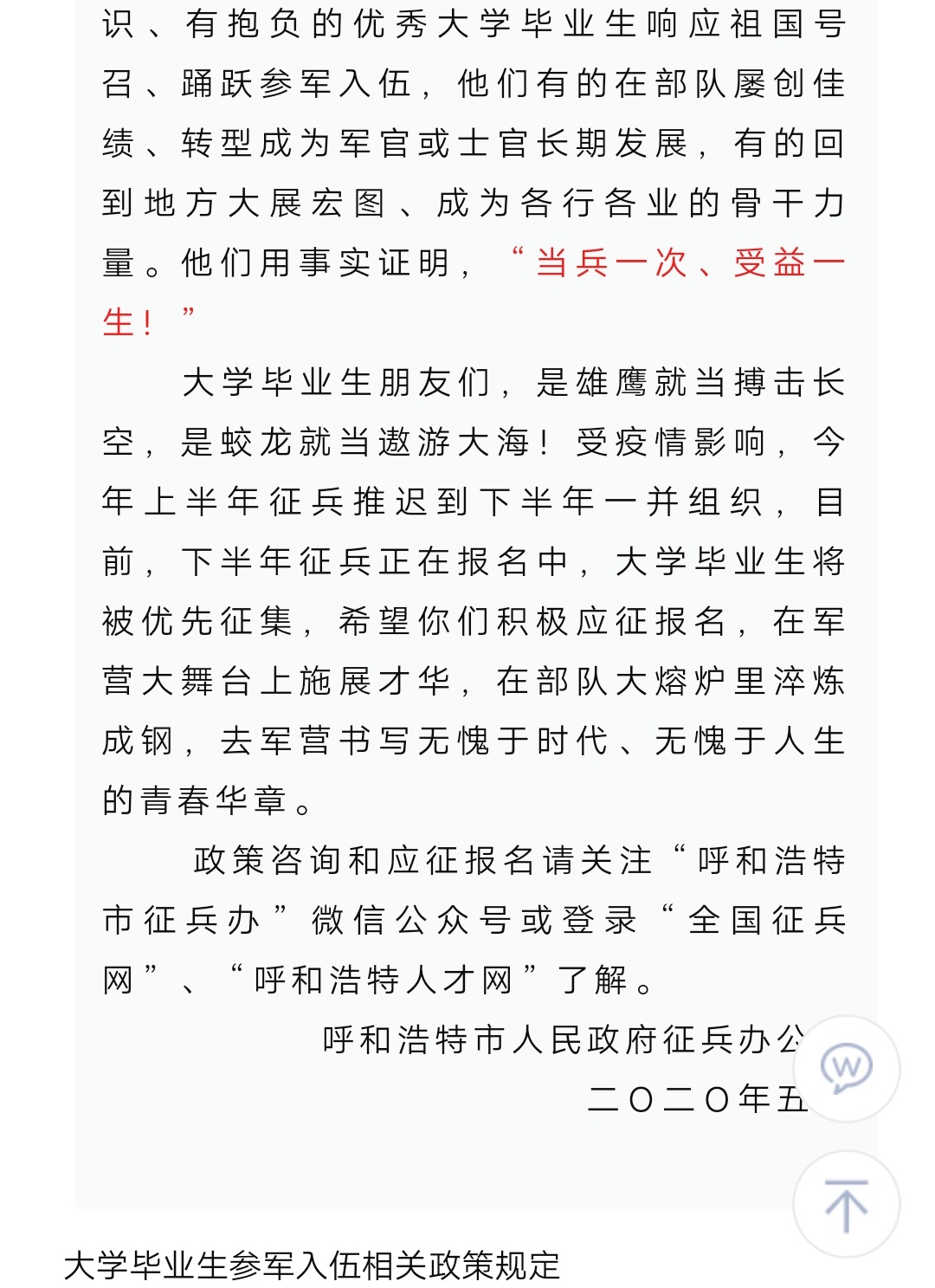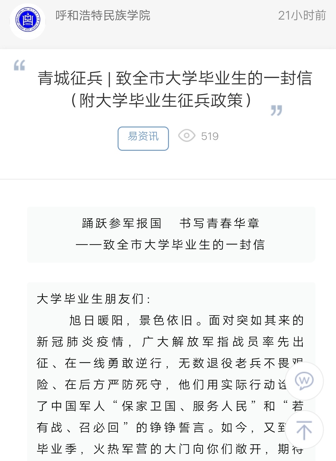 青城征兵 致全市大学毕业生的一封信(附大学毕业生征兵政策)