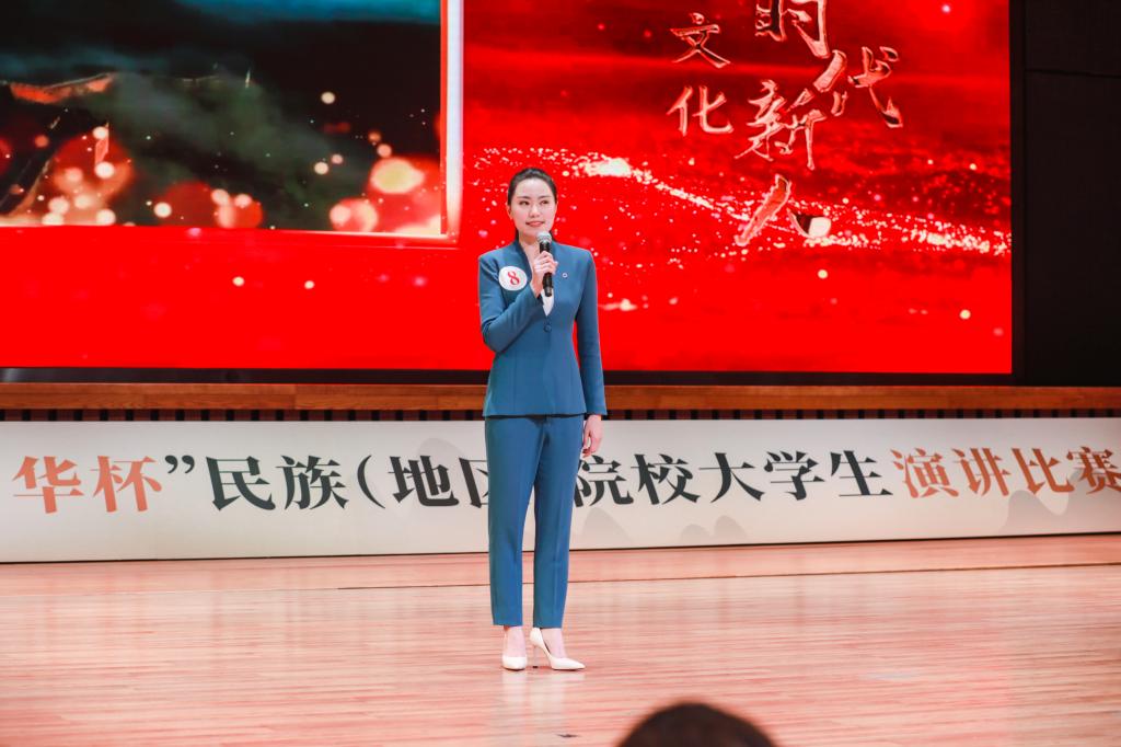 张翎艳以《弘扬中华文化 争做时代新人》为题,以内蒙古自治区从古至今为民族团结所做出贡献的英雄人物引入,通过分享草原上的人间佳话,阐述了各民族交往交流交融的感人故事。她在演讲中提到,每一个故事都激荡着中华传统文化的深厚力量,散发出熠熠生辉的独特魅力。在坚定文化自信和铸牢中华民族共同体意识的道路上,需要我们这一代青年立足中国大地,讲好中国故事,发出中国声音,用实际行动做文化的传播者、继承者、发扬者,让更多的人能够了解中华之美,让中国之美走向世界!