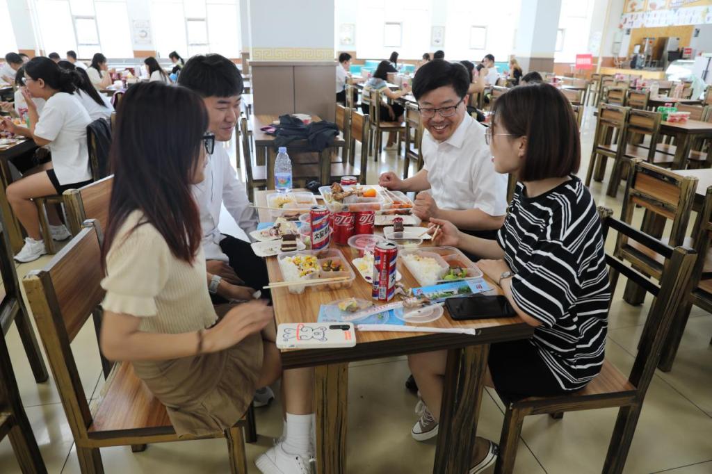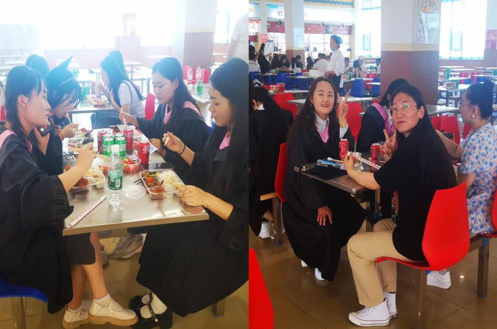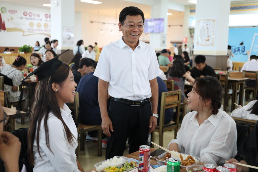 6月29日,米乐官网2023年毕业典礼和学位授予仪式结束后,后勤管理处餐饮服务中心结合主题教育,在南餐厅启动“青春不说再见”活动,为毕业生和老师们提供免费午餐,一起品味呼民院味道,以暖心的方式送别毕业生。校长韩伟新、副校长高喜天来到餐厅与毕业生共进午餐,与毕业生亲切交流,了解他们的毕业去向和职业规划。