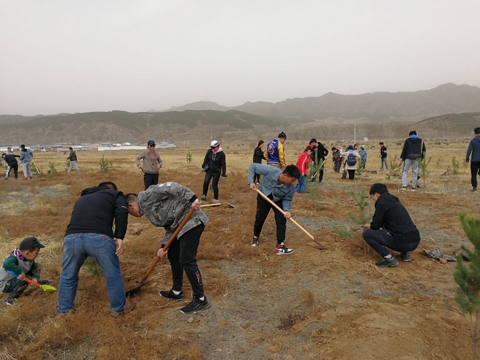 初春的山坡上一片热火朝天的景象,师生们个个热情高涨,有的挥锹挖土,有的扶直苗木,有的培土浇水,各个环节衔接有序、配合默契,一个上午的时间共种植了230株树苗,为圣水梁山坡披上了新的绿意。