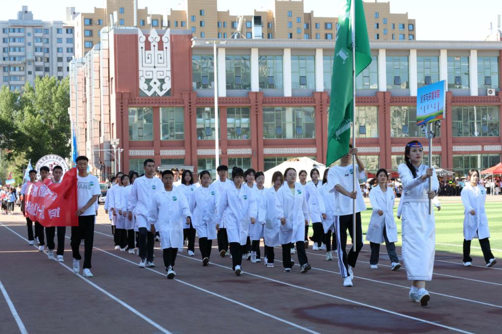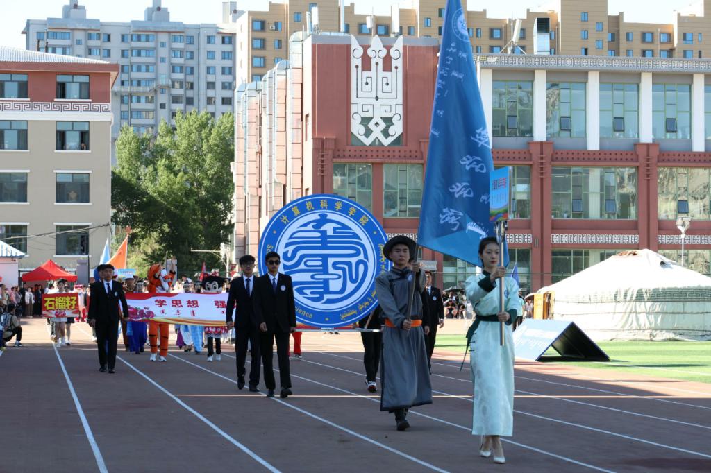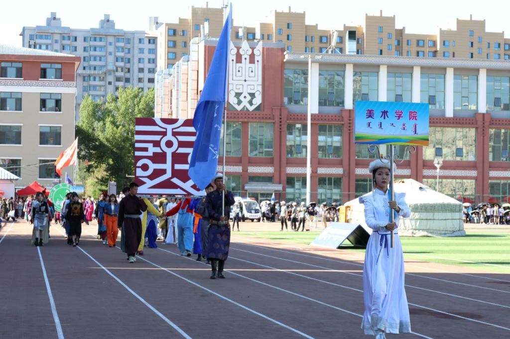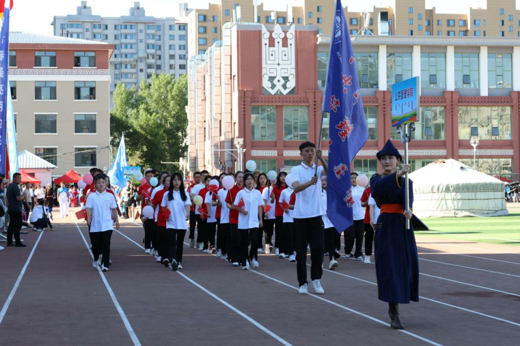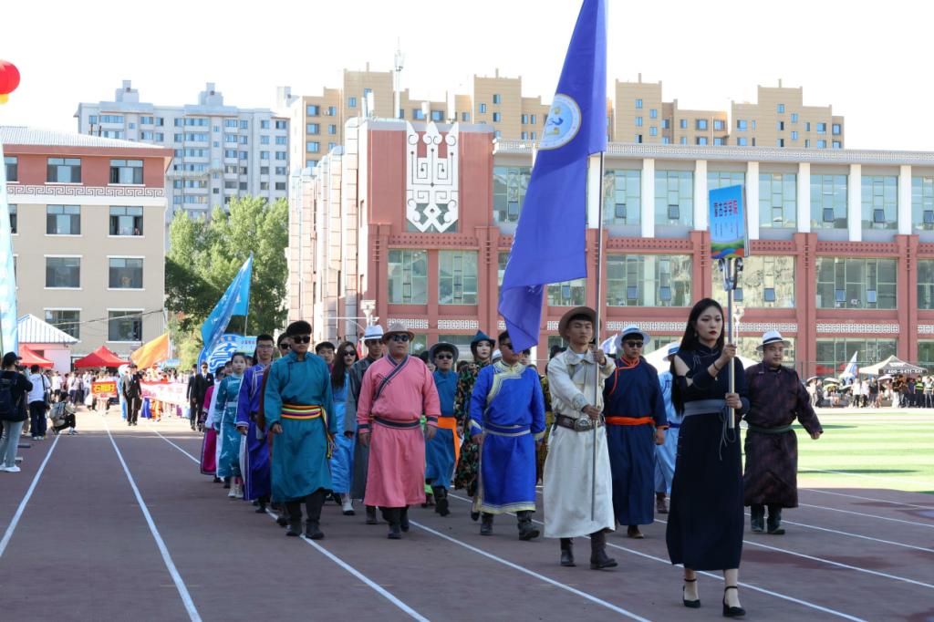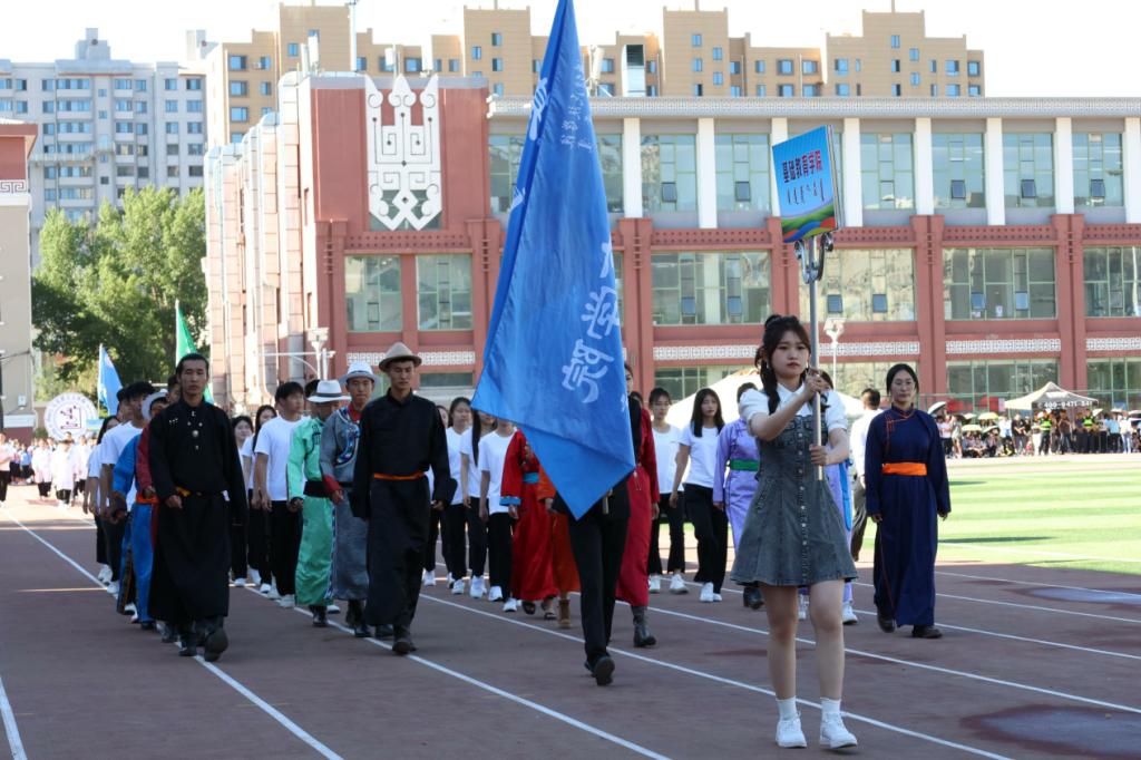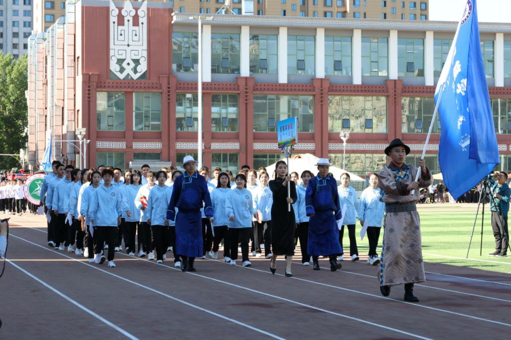 马背彩旗队、石榴籽小课堂方阵、传统武术队以及身着特色服装的搏克代表队、射箭代表队、布鲁代表队、喜塔尔代表队、蒙古象棋代表队、包根吉日格代表队、沙嘎哈日靶代表队、抢枢代表队等传统项目队和各学院代表方队依次入场。他们步伐健朗,整齐划一,喊着响亮的口号,充分展示了米乐官网师生积极向上的精神风貌。