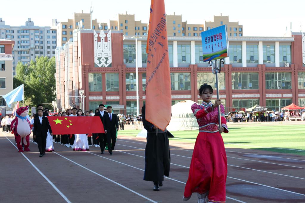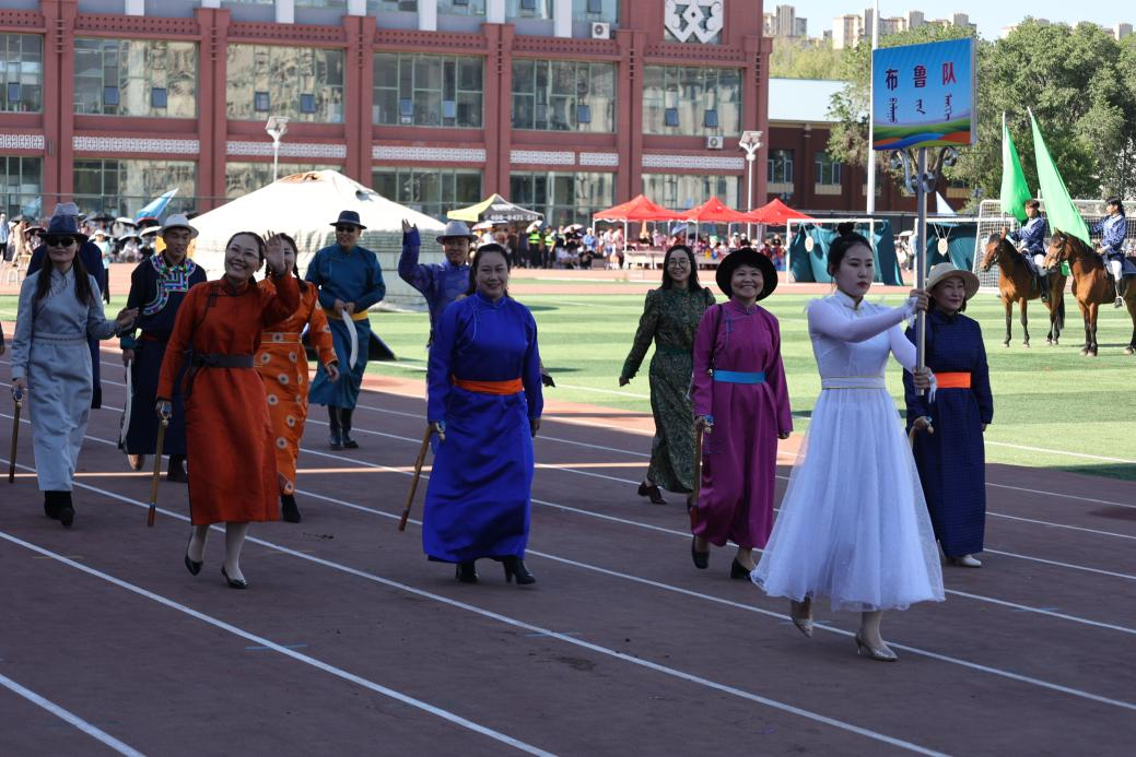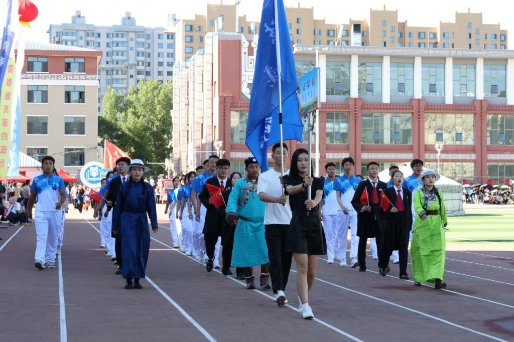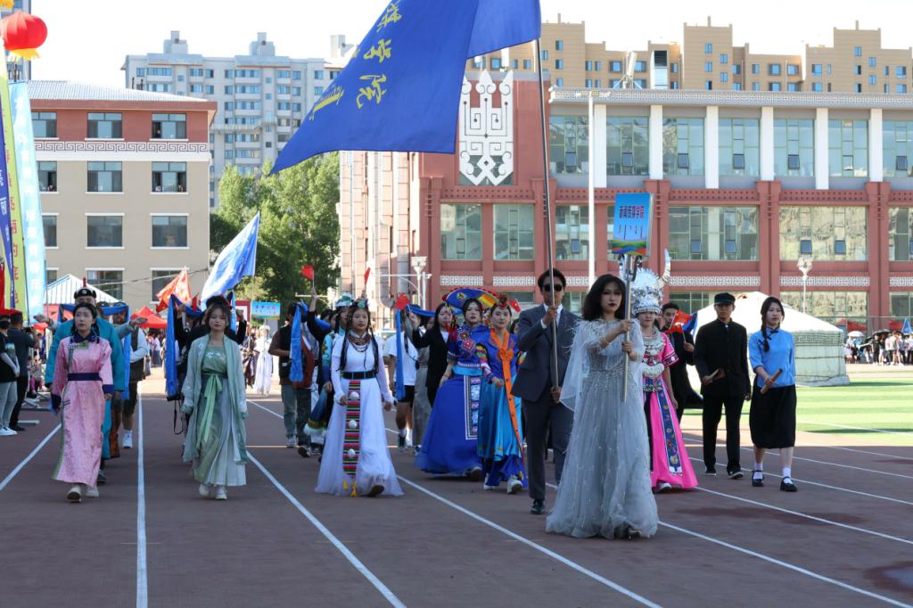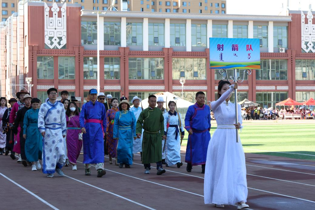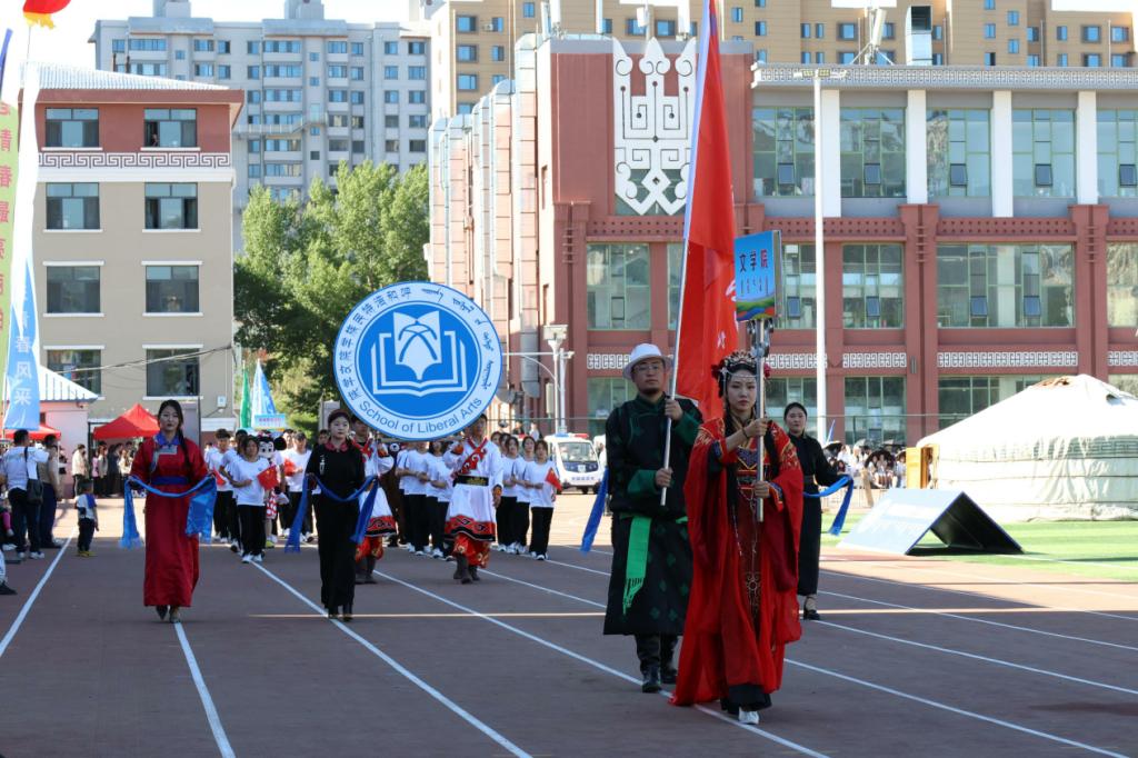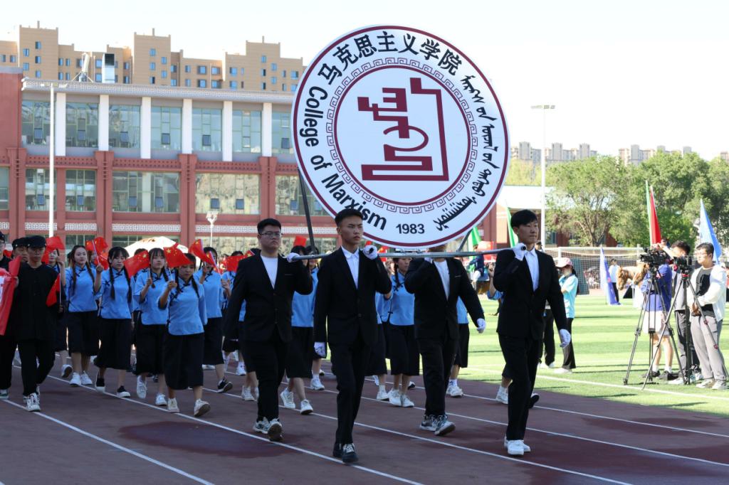 马背彩旗队、石榴籽小课堂方阵、传统武术队以及身着特色服装的搏克代表队、射箭代表队、布鲁代表队、喜塔尔代表队、蒙古象棋代表队、包根吉日格代表队、沙嘎哈日靶代表队、抢枢代表队等传统项目队和各学院代表方队依次入场。他们步伐健朗,整齐划一,喊着响亮的口号,充分展示了米乐官网师生积极向上的精神风貌。