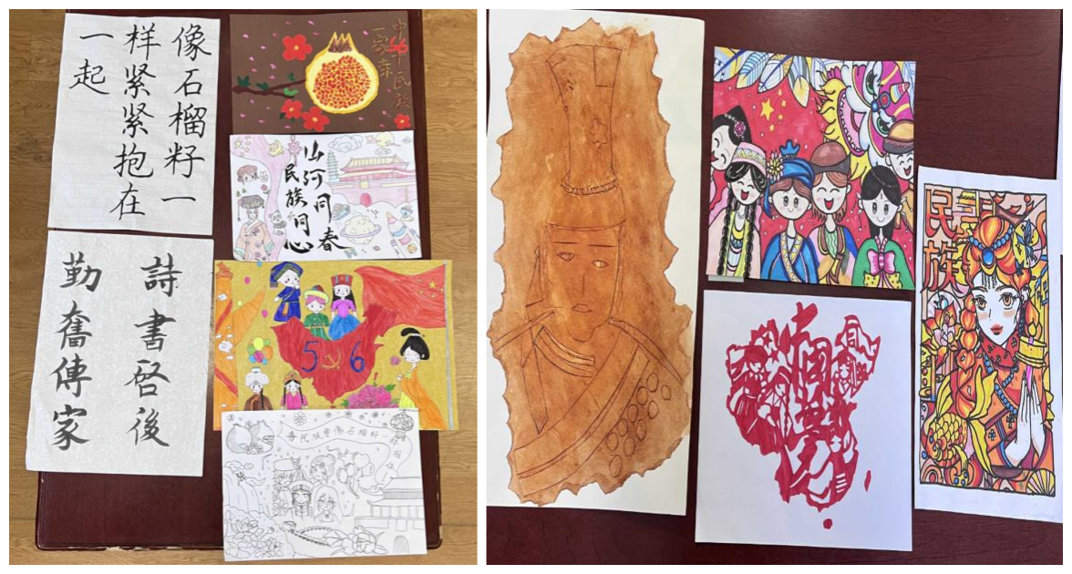 同学们在中华优秀传统文化的根脉中滋养创作,以书言志、以画寄情,充分展现了全国各族人民群众在开启全面建设社会主义现代化新征程中像石榴籽一样紧紧抱在一起,共同团结奋斗、共同繁荣发展的生动画面。