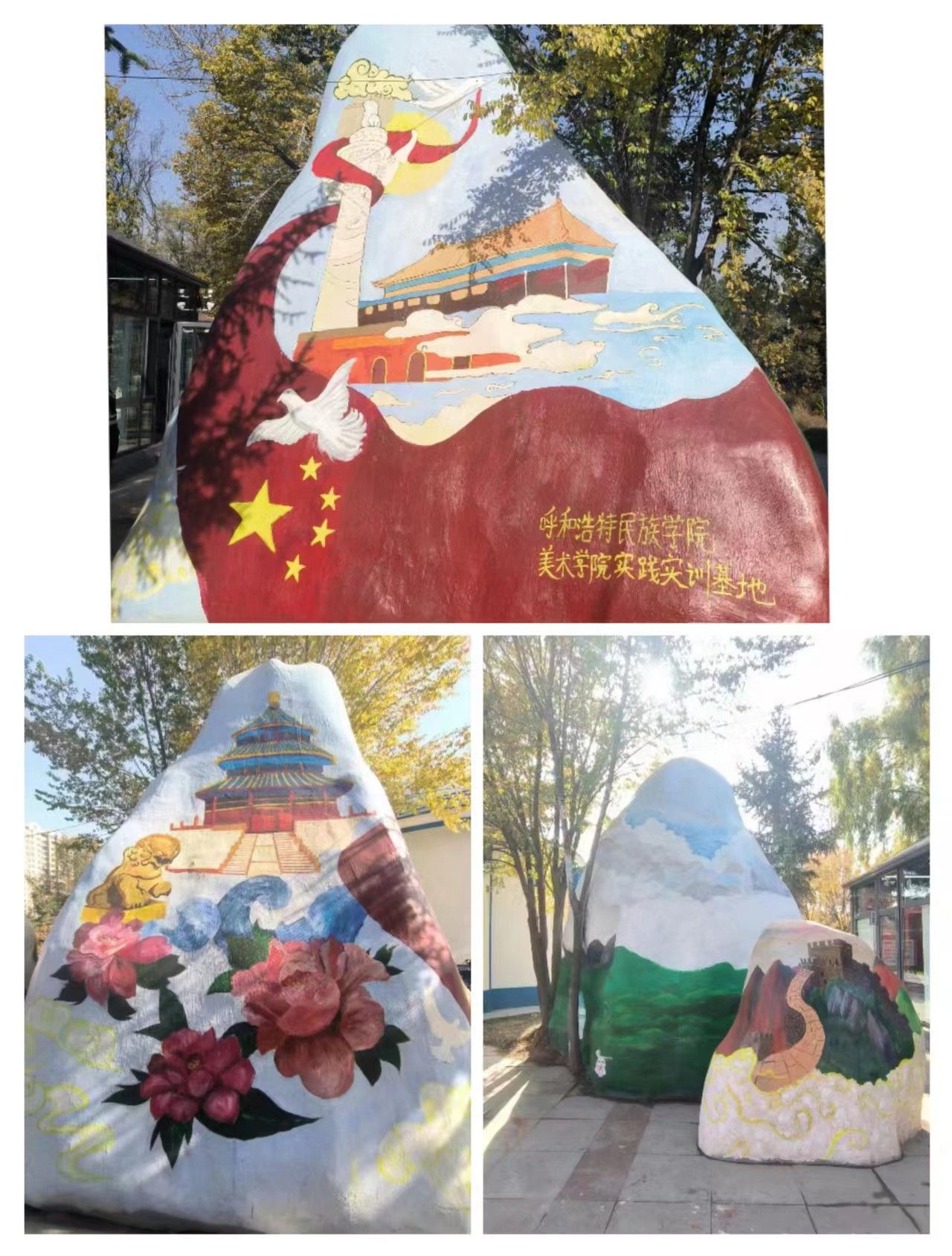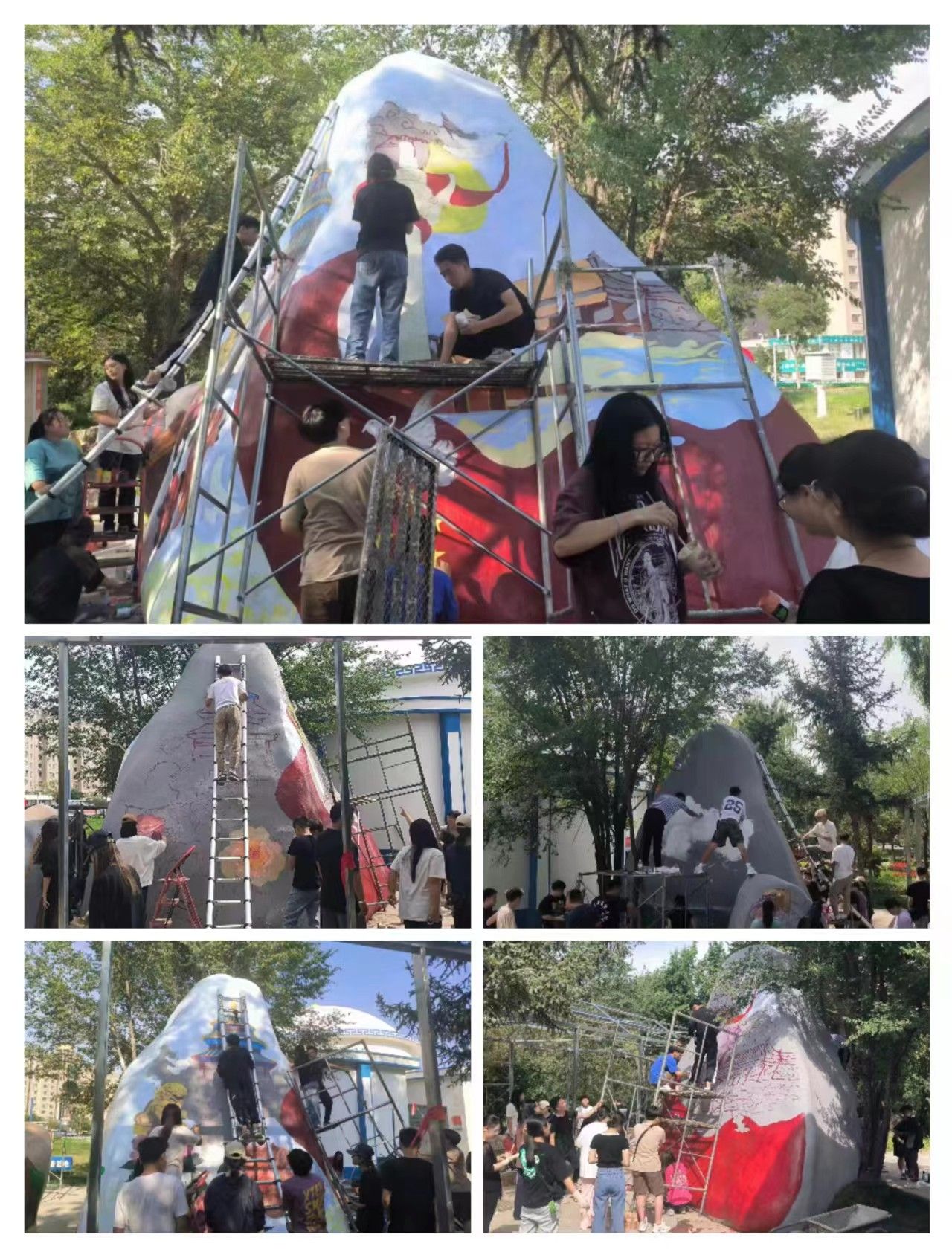 “红石榴”志愿服务主题公园坐落于通道北街和成吉思汗大街交汇处西北角。园内设有同心广场、红石榴造型雕塑、北疆文化长廊等多个宣传载体,其中四面菱形高达六米的中华文化符号景观石的彩绘工作由米乐官网团总支书记魏伟带领党员志愿者服务队累计120余人次,历时15天,累计服务时长2000小时完成。志愿服务队根据内蒙古北疆志愿服务联合会的需求,本着弘扬“奉献、友爱、互助、进步”的志愿服务精神,利用每天课余时间,科学统筹、合理安排,分工明确,提前定稿,做好前期准备工作;开工后又遇暴雨冲刷,重新返工,全力补救,几经艰辛,完美呈现出天安门广场、天坛公园、万里长城等最具代表性的画面。