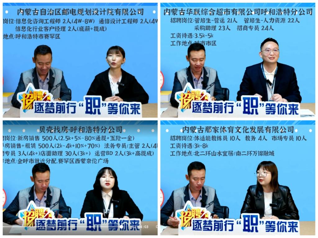 本次直播活动共有内蒙古航天信息有限公司、内蒙古正大有限公司、北京曦技软件技术有限公司等11家优质企业,携1366个就业岗位与毕业生直播交流,招聘岗位涉及教师、IT等39个专业、行业,共有3811名毕业生参加此次直播带岗招聘活动。